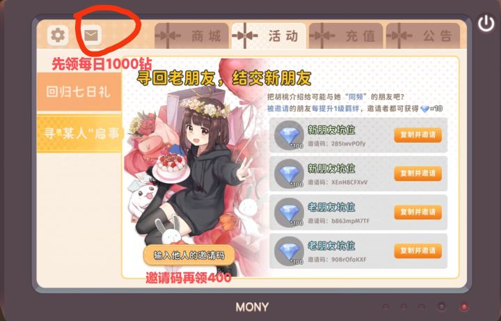 现在炸服了,维护中,没上线的可以看一下上线时,点击电视机邮件领每日的1000钻(共7000钻),活动邀请码可获得400钻修复补偿2000钻兑换码:HUTAO4EVER(100钻)抽奖是十连抽是980钻,每周前十抽都有打折每日要喂三顿饭,做任务和吃饭都可以提升好感度(可以在冰箱提前先放六顿)大家看到tap下载的是渠道包,问有没有官服?查了好像没有官方服务器,安装的都是渠道包(没钱,共用