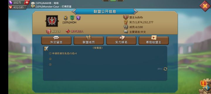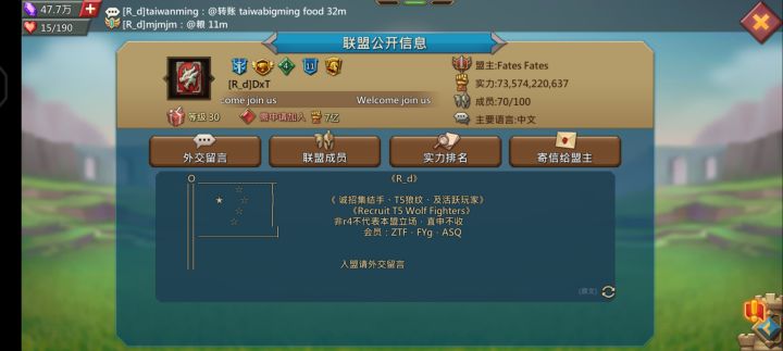 R_d联盟收人盟内多名集结手,但联盟缺人缺得紧以下是联盟一些基本要求1:一周35只2,盟动另有通知2:需要较为活跃的人3:火龙远征可以积极参与盟内设有两个仓库,以便单产的盟友换取其他资源,打架有报销资源,盟动过了一定要求会有坐车福利安排如果有想法的可以联系一下图2的人审核一下