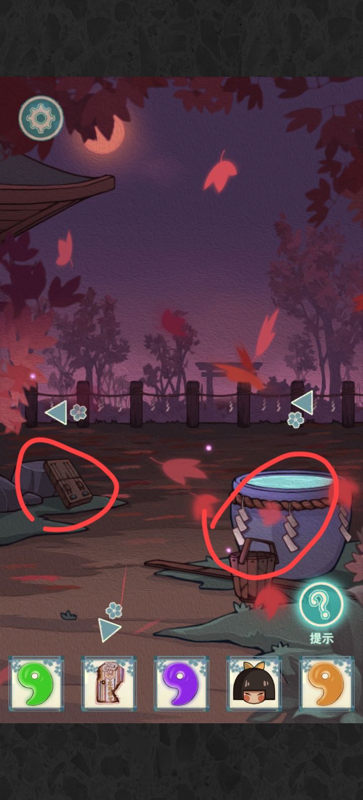 来到右侧平台点击地上的木盒子(让木块上的线同时连成一条线)得到绿木偶头点击右侧水缸完成游戏(在黄色光圈比落叶小时点击落叶)得到钥匙向左来到侧殿用钥匙打开桌上的盒子得到半块玉佩根据地上的影子完成左侧窗花游戏进入里世界在桌子下的箱子里得到巫女服点击上方架子完成小游戏(同时让锁打开)在墙上的格子里得到蓝钥匙向右来到平台·里点击地上的木盒完成小游戏(同之前一样练成一条线)得到红木偶头点击