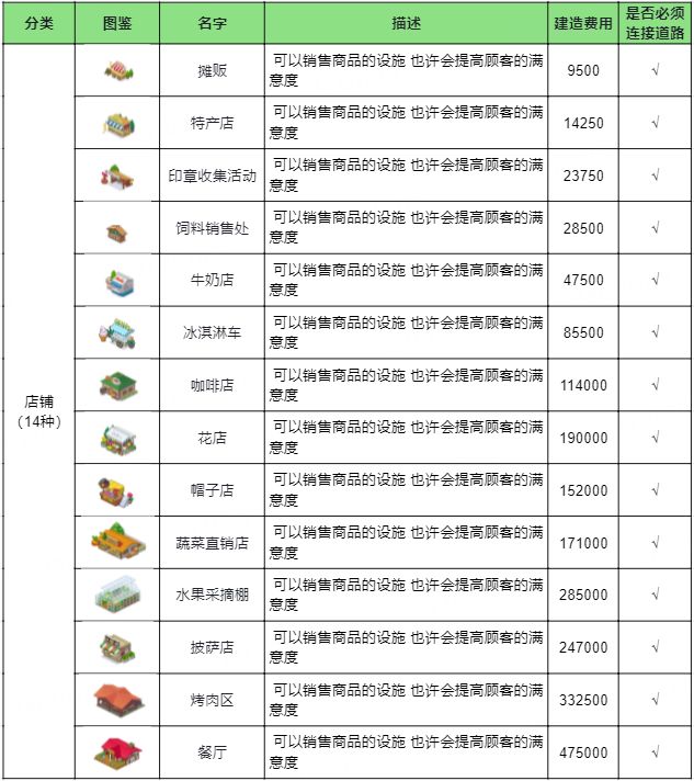 【建筑图鉴】店铺、环境、设施建造费用一览