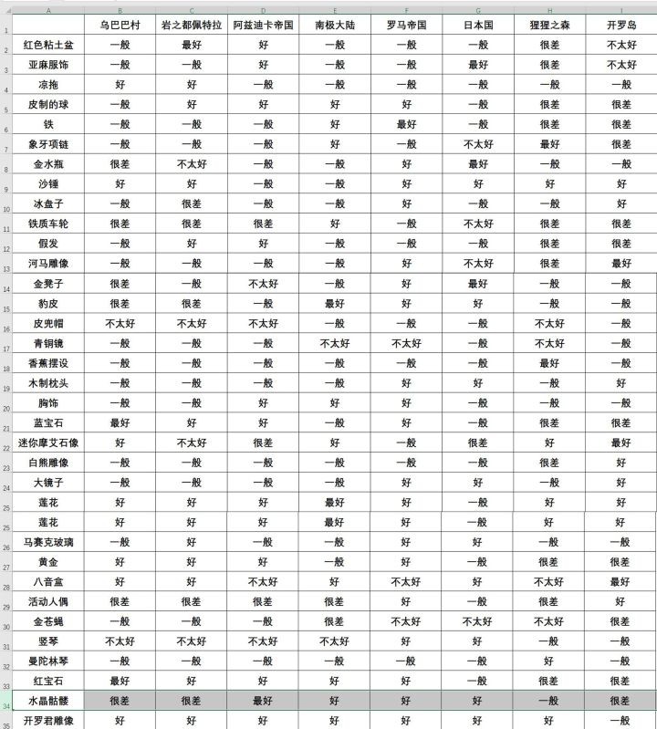 员工总人数15名,手推车石头上限150。前期不用盖石头房,盖6间骆驼店+6提升贸易数量;运动灵巧等加属性店铺无上限,直接建造比先扩建再建造省石头。每年3月金字塔评分,10月份购物狂欢节。交易——雷天同乌巴巴村受众:好-凉拖,沙锤,迷你石像,莲花,八音盒,开罗像岩之国受众:最好——红土盆好:凉拖,沙锤,假发,莲花,马赛克玻璃,八音盒,开罗像狗国受众:最好——水晶头颅好:红土盆,亚麻