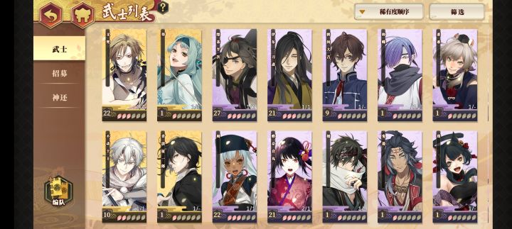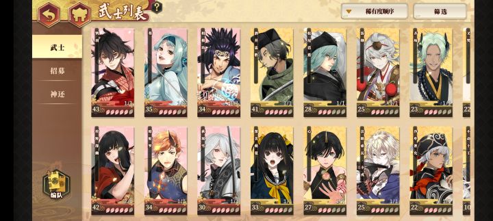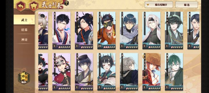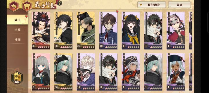 SSR新手自选16卡分别:幕府人族势力:光国,探幽,芭蕉,酒井师生三人稀人组:大吉,清波,萌夏常夜稀人:琉胡鬼族:葵人族:一刀、鸨羽、沙牟、茶半次、卡戎妖族:饭纲、相模坊——————————————分割线,接下来就是随缘更新了,基本只更新我已经拉到60级的,再不济也得6花。每次更新我就注明写到哪个了。已加更:樒、唐狮子、不动十王、橘道生第1位:德川光国武士武器:太刀(朝阳、残心)