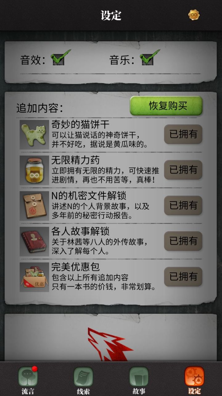 历史购买恢复一点就闪退,花了一个小时翻了两年支付宝账单找到图片结果反馈没法上传。想我重新购买就直说→_→。Btw,(支付宝账单名称:解锁全部追加内容,分类:休闲生活),希望你们能找起来方便些。