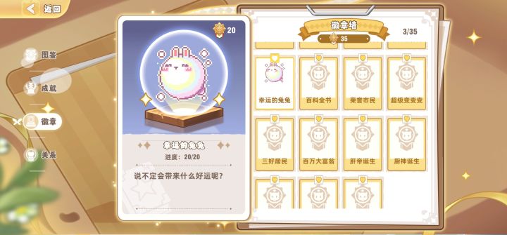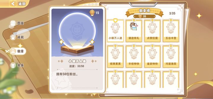 主线最后一个任务要三个徽章,当时我第一眼看到的时候真的被吓坏了这些徽章每一个的条件都好苛刻的样子,都不想做经过仔细查看以后,我觉得这四个徽章是相对来说好拿的,如果有需要的宝宝可以看一眼p1小镇万人迷:虽然这个我没完成,但是个人觉得应该是一比一的简单,随便找个人多的地方,或者直接在世界大喊一声:互关dd!就会有好多人来关注你啦,务必记得要关注回去哦p2谦逊有礼:点开