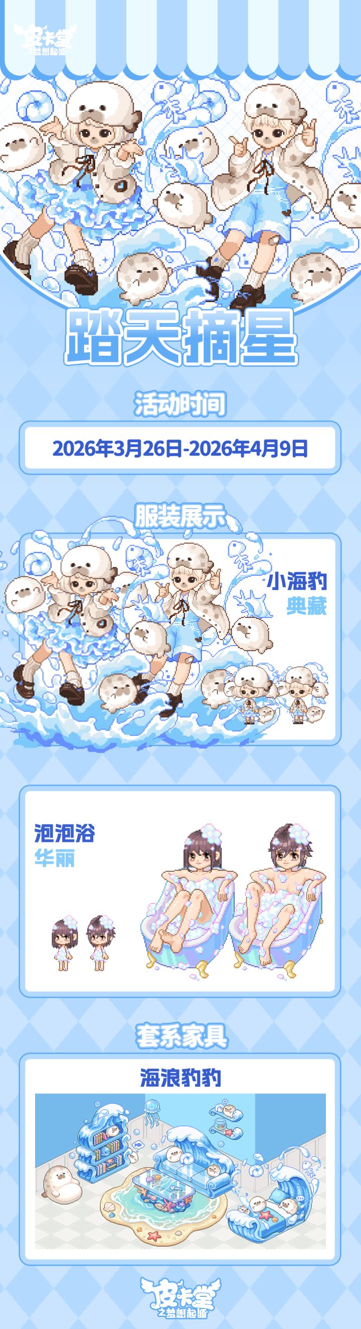 -【踏天摘星】不枉有心者,踏天赴星约,参与活动将有机会获得典藏套装「小海豹」、华丽套装「泡泡浴」以及套系家具「海浪豹豹」!-【LUCKY大冒险】上新典藏套装「兔兔仪仗队」、稀有套装「咖啡小憩」,套系家具「奇妙彩蛋」!-【赛季经营】完成赛季任务可获得S15赛季专属称号「枯木见春」、配饰「风车发夹」、头像框「春桃之约」、气泡框「竹林纸鸢」!挑战完成任务领取全新的赛季奖励吧~-【折扣异装】返场啦!