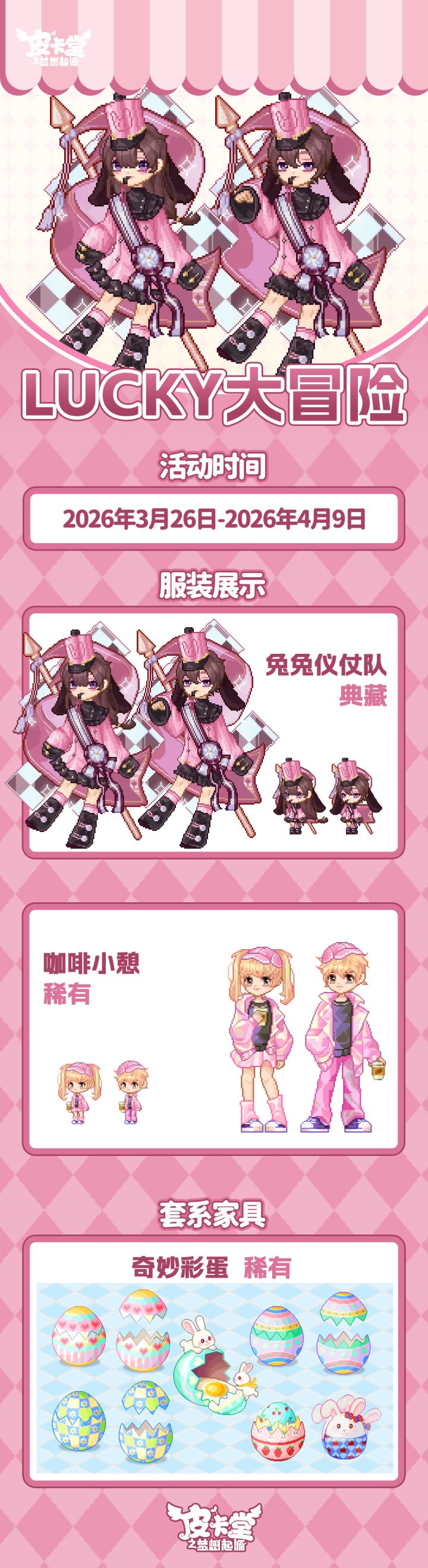 -【LUCKY大冒险】上新典藏套装「花花幼稚园」、稀有套装「童稚时光」,套系家具「稚园午间」!-【设计师教室】知名服装设计师阿拉克涅开设了设计师教室,皮卡亲们都可以找她学习制作装扮图纸,阿拉克涅还会给予勤奋的学员额外的奖励。-【丰收通行证】更新上线!购买通行证并完成对应任务可获得套系家具「宅野集」、华丽套装「海盐可可」,加购高级通行证可获得本期丰收活动限定聊天气泡「春分来信」!-【金冠兑换】