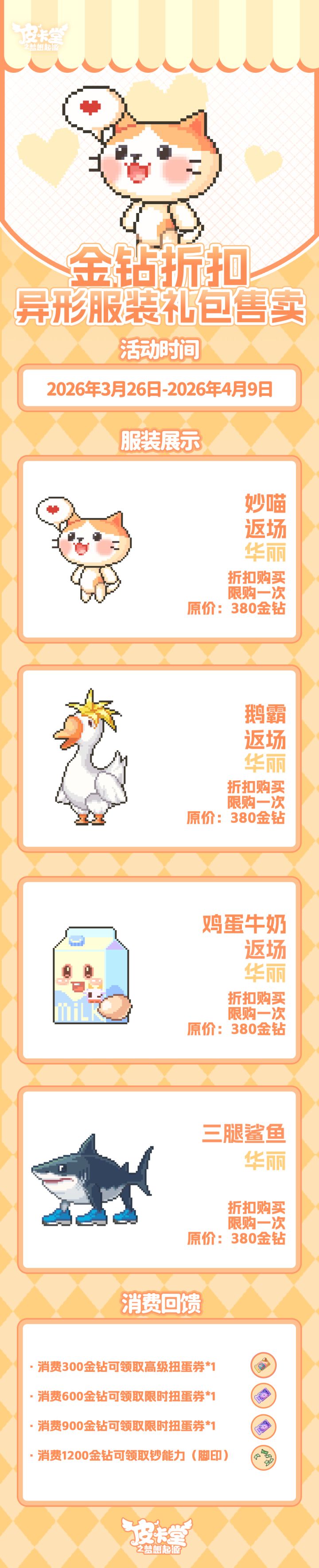 -【潘老板密库】上线!参与活动可获得典藏套装「织梦郁金香」、典藏套装「危机狂想」、华丽套装「饮咖一刻」、稀有套装「闪闪黑曜」以及「菜喵驿站」套系家具!-【累充小店】头像框「萌芽絮语」、小屋主题「喵趣丛生」、套系服装「踏春心情」等奖励等你来拿!-【直售礼包】全新稀有套装「绒绒兔兔」上线、华丽套装「暹罗喵」返场!-【限时金币扭蛋】返场!可使用限时扭蛋券/金币抽取,参与可获得典藏套装「月隐千面」、