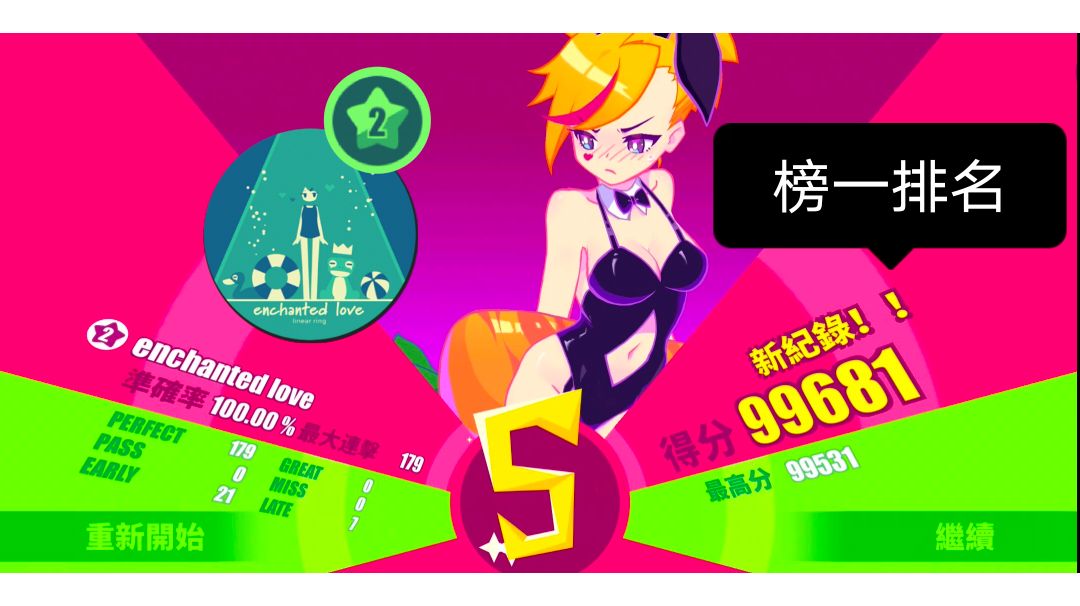 分数:99681 目前移动端排行榜第一 曲包:放弃治疗10 配置:兔女郎 莉莉丝 手动fever点如下: 59-71【注:需59打late 71打early 极难】 126-137