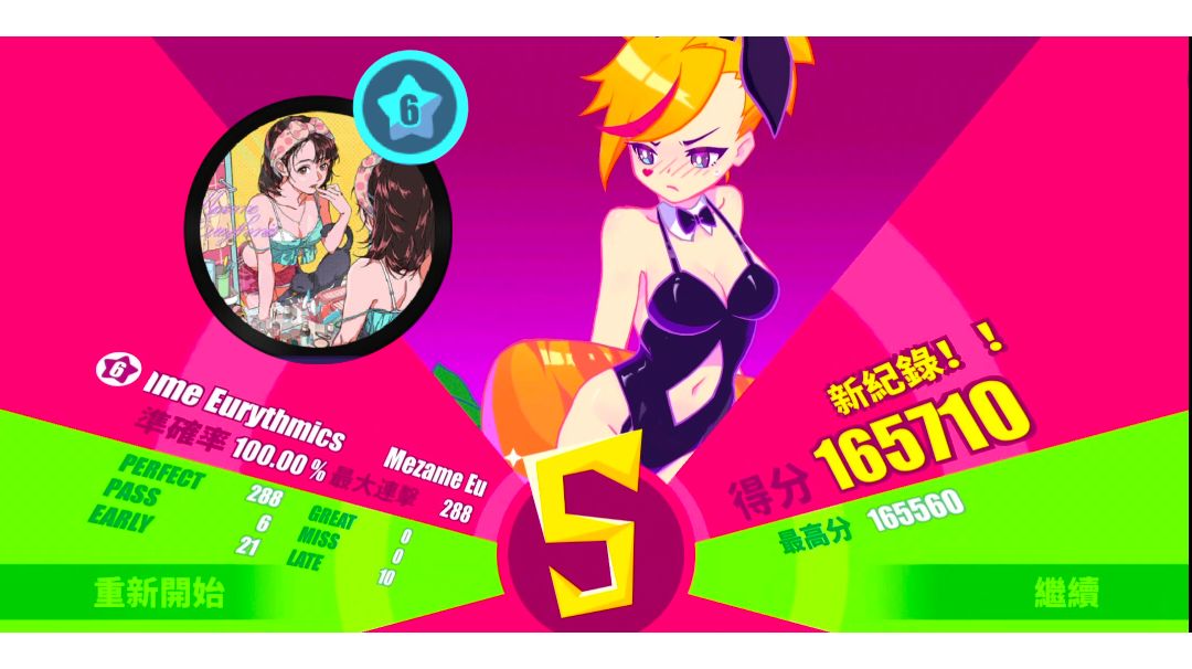 分数:165710 目前移动端排行榜第四 与榜三同分 配置:兔女郎 小龙女 曲包:基础包 手动fever点如下: 59-64 122-136(注:122打late或者136打early容易进) 196-207 270-286