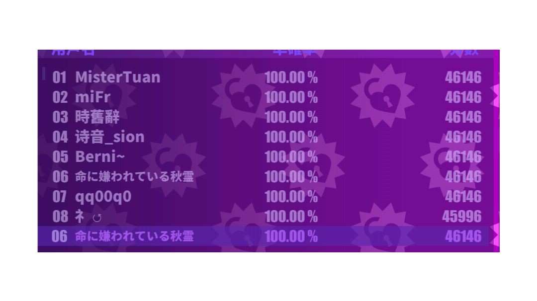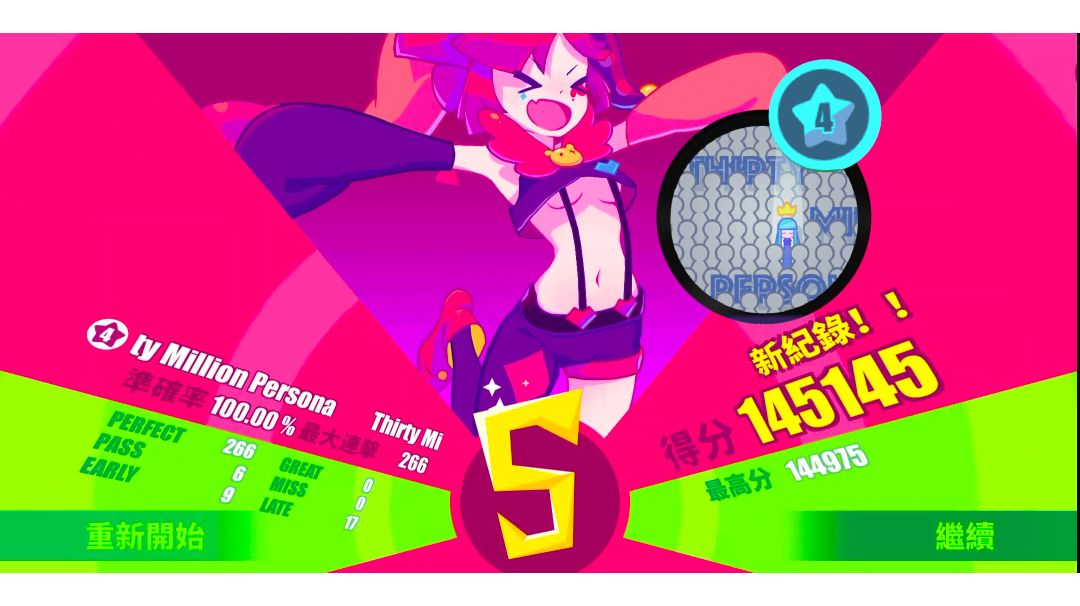 分数:145145 目前移动端排行榜第四 曲包:肥宅快乐包3 配置:华服布若 小龙女 手动fever点如下: 63-80 166-182 246-259