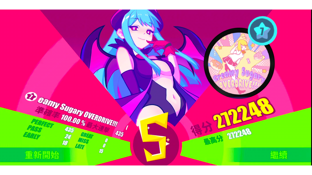 分数:272248 目前pe排行榜第一 曲包:放弃治疗8 配置:小恶魔 莉莉丝 手动fever点如下: 57-87 144-169 215-239 294-314 403-432