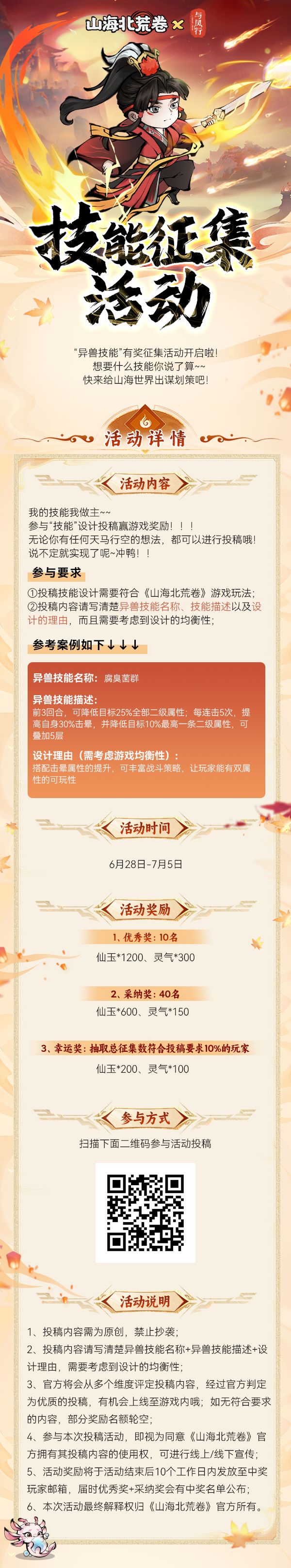 技能有限,创意无限!为给游戏注入更多新鲜玩法,第二期“异兽技能”有奖征集活动来咯~各位仙友速来参与赢取丰厚奖励!⏰【活动时间】⏰2月27日-3月4日🔔【活动内容】🔔创意无限,异兽技能由你设计~~让你的技能创意成为游戏的一部分!参与要求:①投稿技能设计需要符合《山海北荒卷》游戏玩法;②投稿内容请写清楚异兽技能名称、技能描述以及设计理由,而且需要考虑设计的均衡性;参考案例如下↓↓↓异