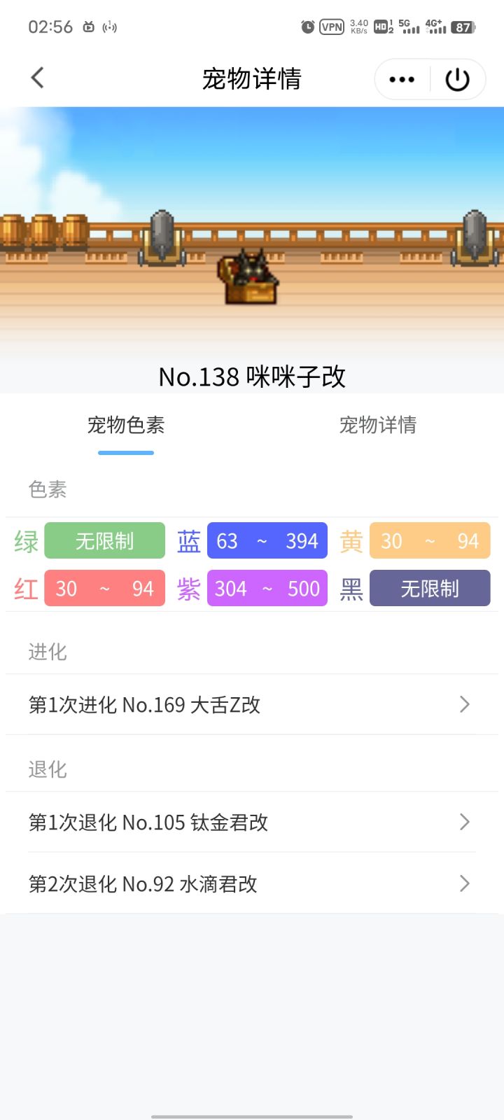 首先要知道咪咪子改的色素区间,打开小程序查看一下接着,挑选任意5⭐蛋,看上图用色素提升调好红蓝紫,然后用蛋黄抑制把黄色压到0即可(起码要留下两空格)如下图接下如下图操作,点红圈所示的投入这时候蛋的黄色会彻底变成0,其他色素区间符合要求如下图接着再投放3玉米/2熏烤肉➕任意小刀或者蛋紫提升即可