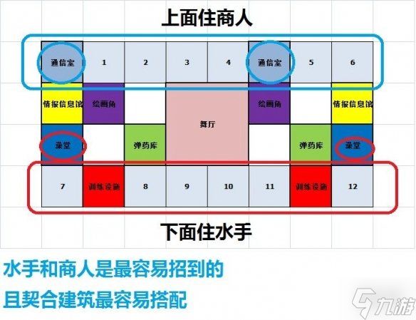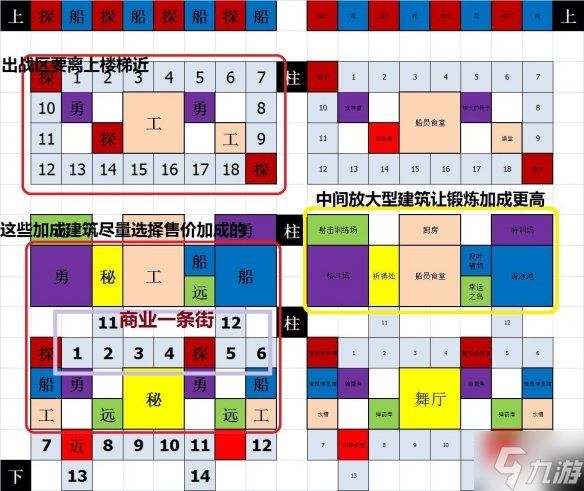 温馨提示: 非专业布局,不是极致省钱,需要花点开罗点,建议噩梦在搞,仅供参考!楼上布局: 住宅区 驾驶室 商业区住宅区 6个战斗队伍住(4个迷宫探险队住竖排,2个甲板渔夫队住横排)中间放7种知识,秘放中间,近远船探工勇(看个人,想怎么放都行)驾驶室有通信、情报、探测和2个航海士商业区有购物步行街、餐吧、舞厅、健身房、水会和各种休闲娱乐设施购物步行街,16个工具人(5个船夫、5个水手、6