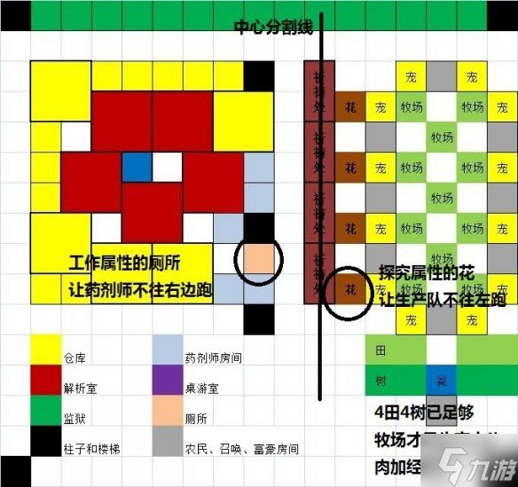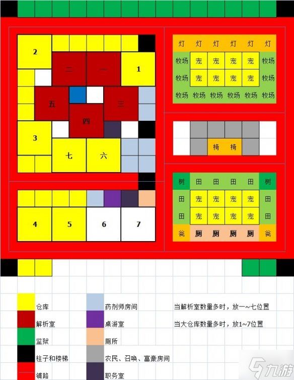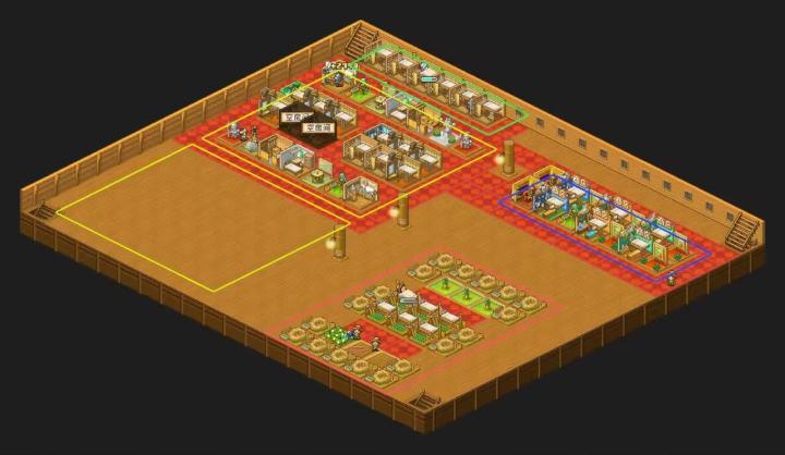 先发图,实用的困难布局。(从绮丽的白里面偷的)绿色区域为渔夫区,转成王国兵后只要挨近楼梯快点去打甲板就行。蓝色区域为商业区,任意6个工具人转成任意种类商人都行,周边建筑优先顺序为:幸运之鸟-绘画角-宝物资料馆-水槽,作用是周边商店商品更贵,当然不放也可以。黄色区域为知识区,如果工具人多也可以放空出来的黄色区域,红色区域为农业区,植树厂和农田都可以,收货的数值要400以上,周边放宠物屋可