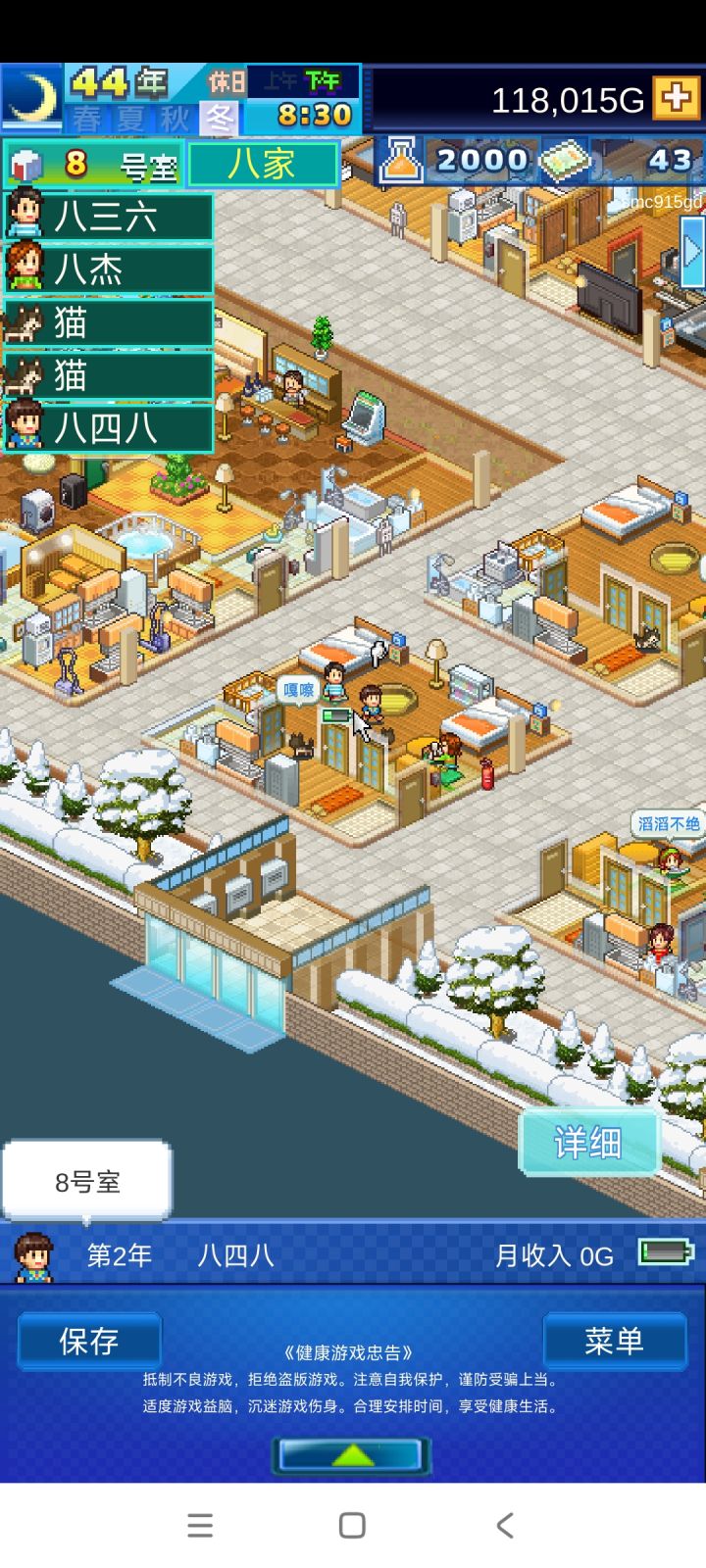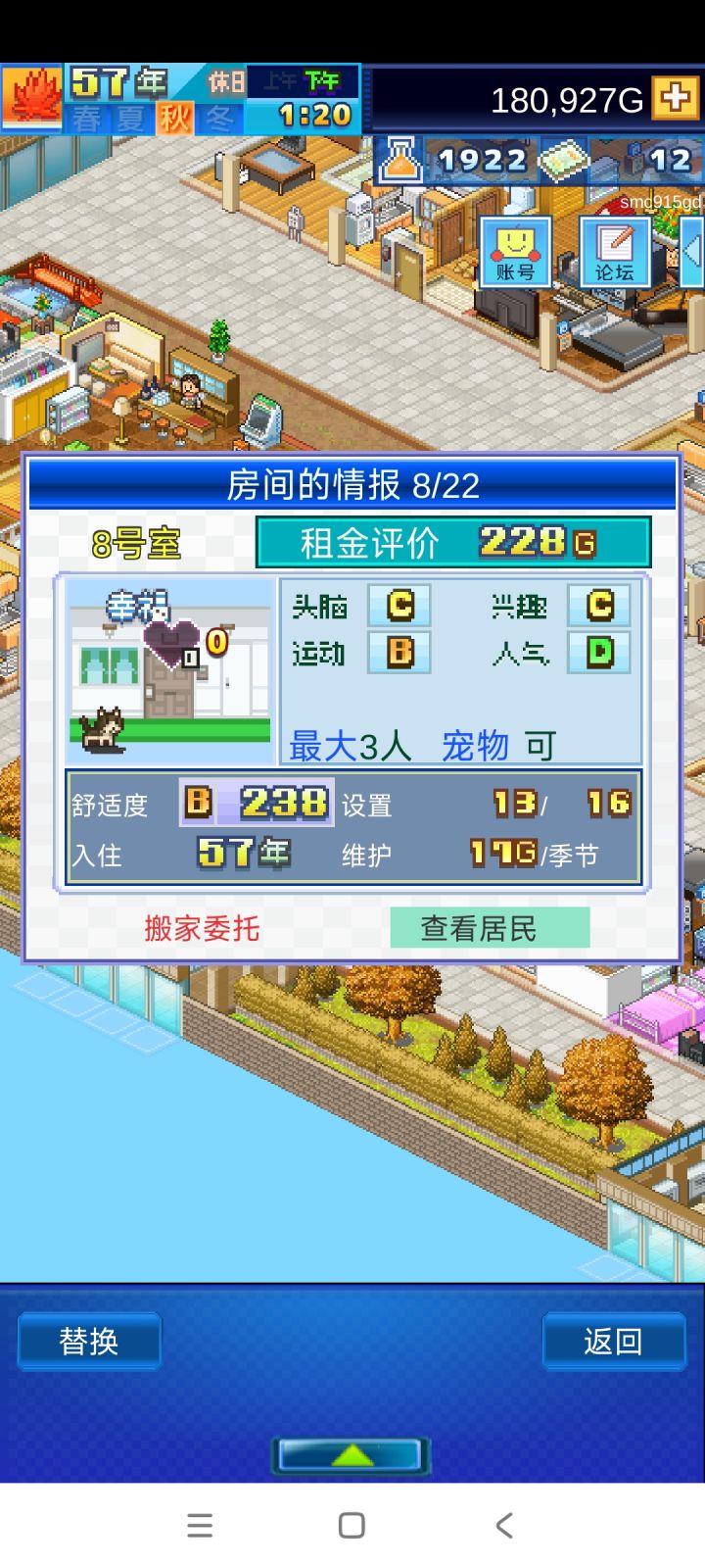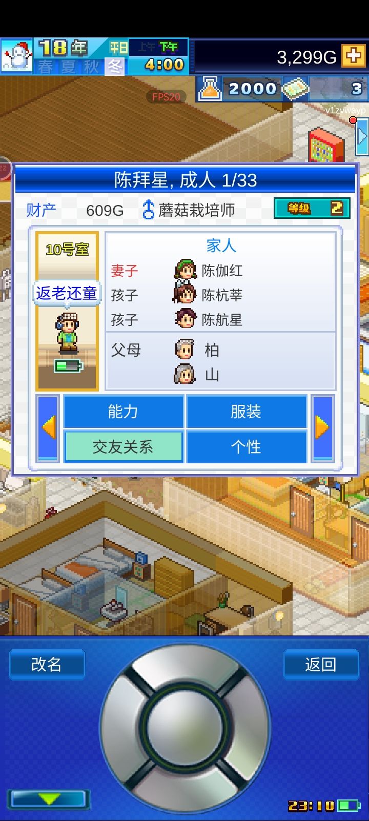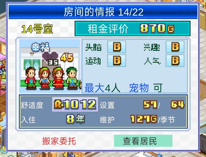 二周目尝试了开局几个房间招完人之后,就不再招募新人,让最初的几个姓氏家族在本公寓一直生活下去。现在顺风区房间已经开完了,留下来三个姓:房、严、郑,房家已经发展到第四代人搬出父母家单住的阶段了。成功玩成家族传承游戏