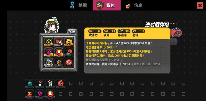 没追求速通,每个房间都清了。如图,最主要的是暴击类的天赋(几率、爆伤、中毒、爆炸)我还缺一个弹反,弹反+范围更适合武士刀(110%暴的几率暴击,刀刀红字....)子弹追踪是用来配合速射霰弹枪的,打香蕉幽灵只需要三枪(高暴击多弹片)而且美玲的被动也有暴击加成