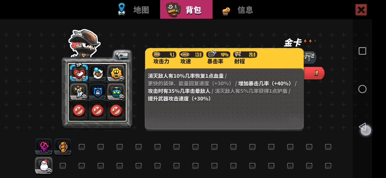 全成就达成,武器图鉴还剩十几把没开,懒得刷了。这次上个论坛才注意!没想到一个单机游戏还能有暗改???过十星比较好过的是熊猫,皮糙肉厚变身无脑干就行了,不知道是bug还是机制,反正我熊猫不受伤杀了boss是从来没见过那个很欠揍的***怪→_→。宠物男前期比较难受,后面一样可以拿把刀砍子弹ob就好了。boss战用苹果人可以无脑通去解锁boss武器。其他角色也有些趣味不一一点评了。武器真的经
