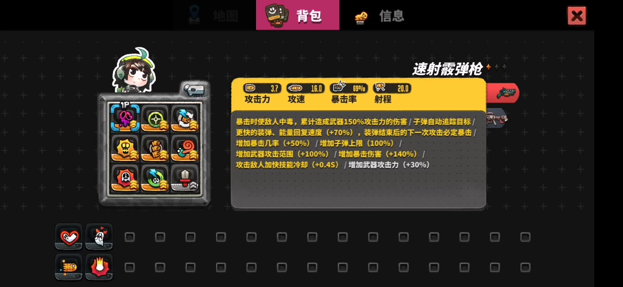 蓄力抵伤直接无敌,范围爆炸伤害可观。“怦怦”的护盾搭配上加速换弹夹/充能的插件可以无脑通关。能量充能目前遇到最优武器,拥有=通关。中远程高速连发,搭配命中插件远程连发Boss哭了。中远程高速连发,比气泡枪伤害高而且能量充能不需要换弹夹,气泡枪上位。中近程AOE武器,两种状态清图优选速伤可观。