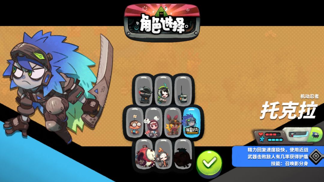 ◎建议使用生存能力比较强的角色:[拳击手-怦怦]、[机甲驾驶员-美玲]-[机动忍者-托克拉]-等……◎[小技巧]:1. 首先要说的就是-[SL大法] 即 [退回主菜单-游戏自动保存-继续游戏],此游戏[保存继续游戏]机制为:即使打完了当前关卡,SL之后仍然要重新打一遍,可根据此机制,不断SL刷新[蓝色天赋贩卖机]、关卡宝箱掉落物、Boss战战利品等……直到拿到满意的掉落物(打Boss时失误了