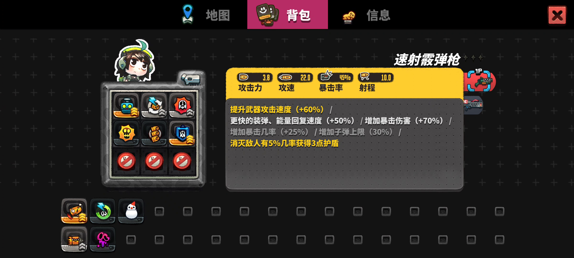 大概摸透这个游戏的核心玩法了:刷强力的武+匹配的配件。前期疯狂苟,等套装弄好了后期无伤清图,打boss也是秒着过的。还有刷出了这个梦幻的搭配:加特林加速射霰弹这两大神器。这两个神器很推荐新手使用,手残党也可以轻松过关,如果有什么不会的可以提问的。