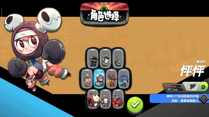 推荐大家使用怦怦 利用自动回复护盾 就相当于血了 而且失去护盾还有一些许的无敌时间 人物升级到8级大招能清除弹道 实在是很保命的角色 玩了那么多角色 这个最适合开荒 另外 推荐被动技能 暴击率伤害增加 暴击率增加 攻速增加 子弹精准度(满级技能能自动打敌人 后期过图无敌)另外 有足够的格子可以选用杀敌回血 杀敌得护盾 弹药增加 武器可以用潜水艇 真的很爽 金卡也可以(如果你想无限穷光蛋的话)有什么