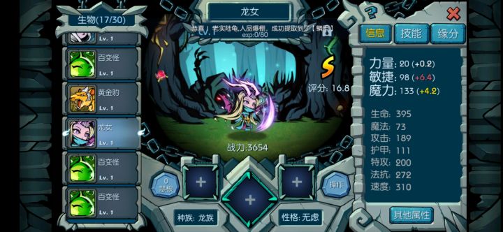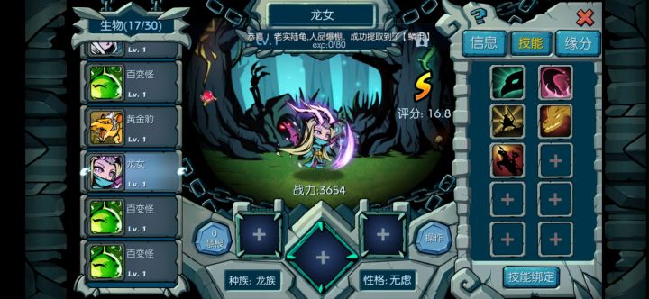 那个首先我也是萌新,但懂了一点点,也没写过攻略,写的不好请见谅。 首先,前期玩的时候,因为食物链等级不好,所以也没什么好的生物,所以就凑合用一个亡灵复活,岩系肉盾,随机法伤,加第二天的异形迅猛,异形迅猛可以用到55链子左右。绑定暗杀技能,然后打技能孔(技能孔最多打5个,5个之后需要融合,打技能孔的时候可以先用价格便宜的盘古石打,等打够5技能了在打自己想要的技能)。等食物链打到可以创造迅猛怪的时候,
