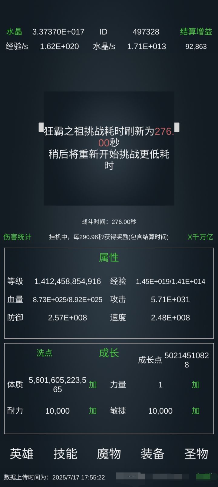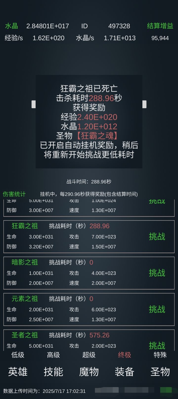 1万亿级过。开局属性:生命4.5E+19,攻击5.52E+17。 技能: 基础:4亿亿级力量强化。霸者、暗影、元素:无。圣者:圣躯700万亿,治疗万亿。装备:靴子洗掉,其余满附灵。 圣物:(圣物没说就是不高,没标注等级就是满级) 低级:凝液、幽灵之链、金币、17万马蹄铁、精灵短笛、木源灵露、力量拳套; 高级:玄武甲、贤者之石、石化魔瞳、霜息指环、毒淬灵液、深渊至宝、饮血之刃、凤凰