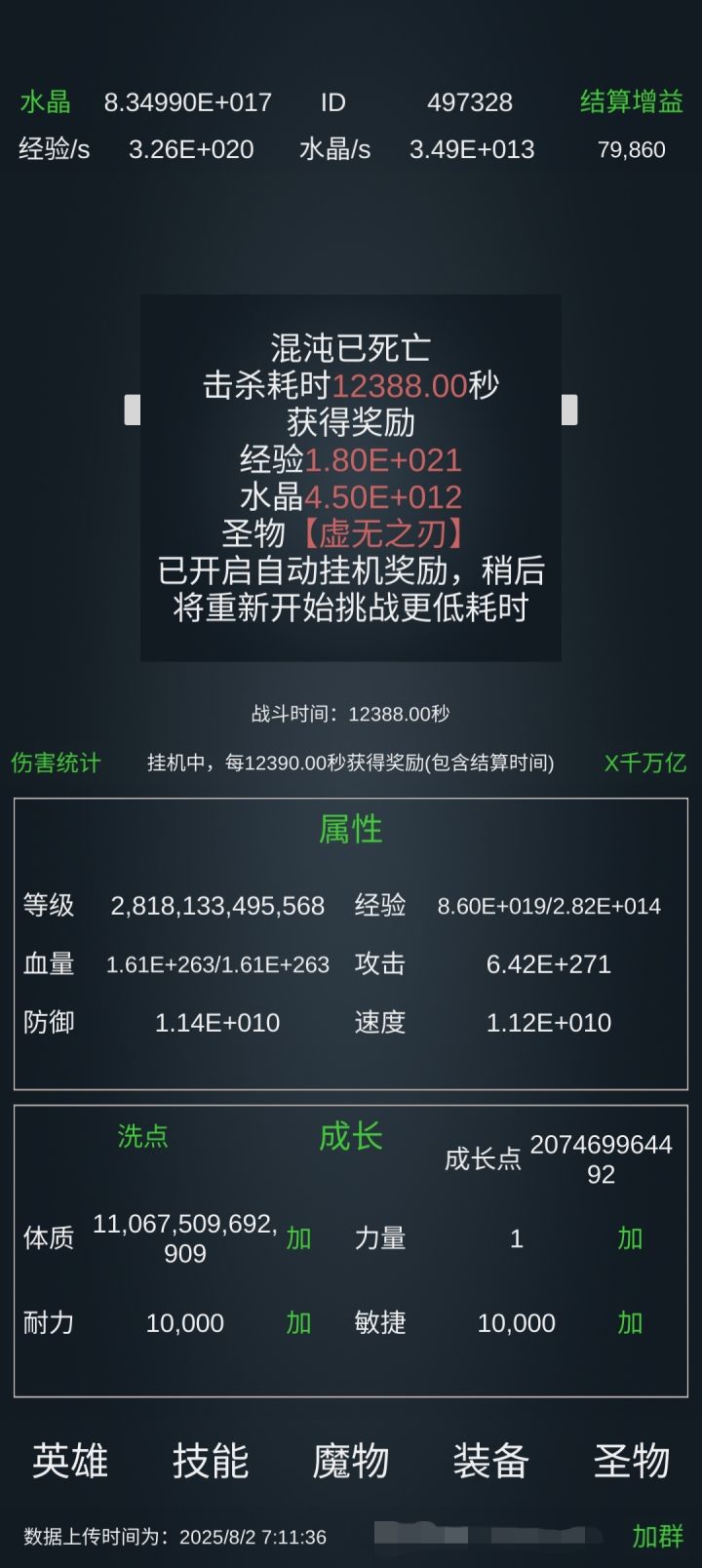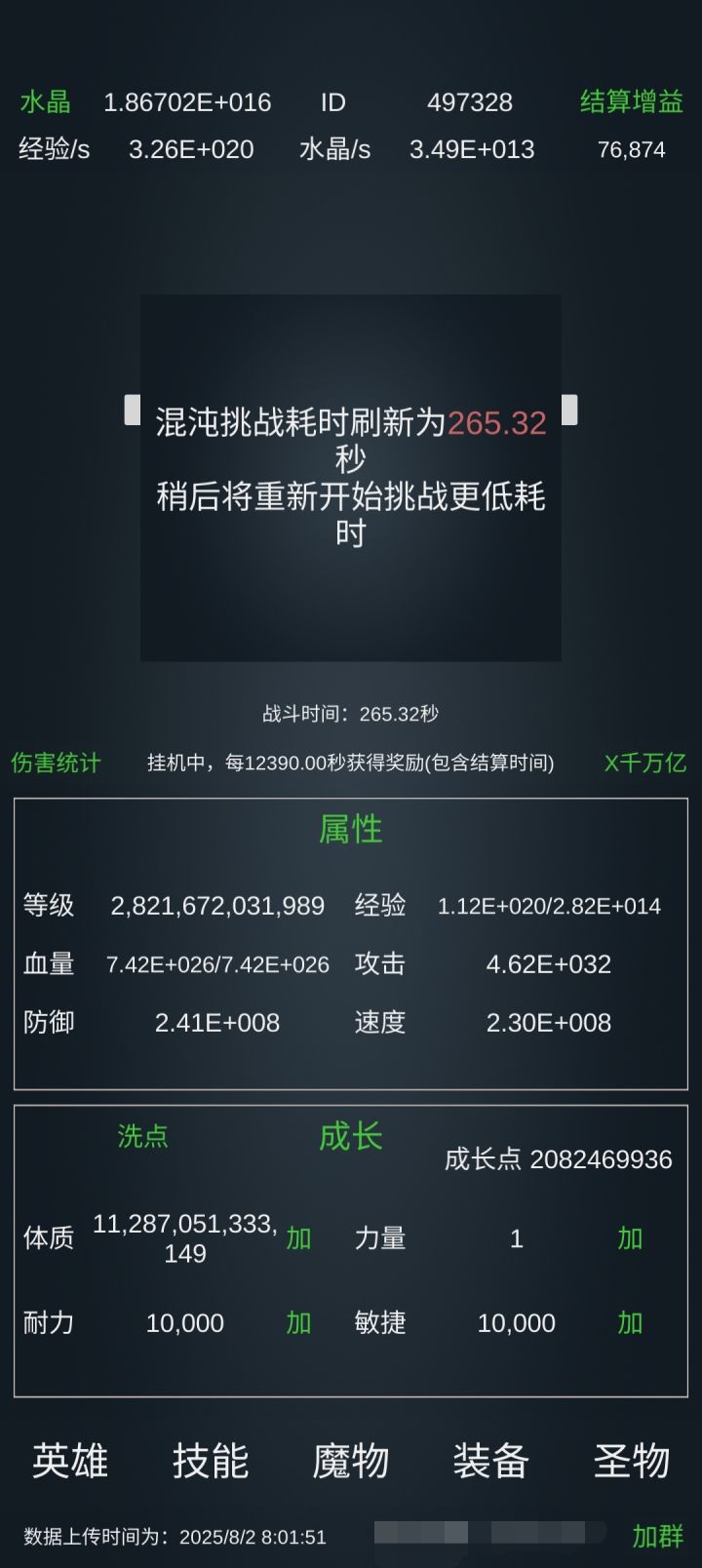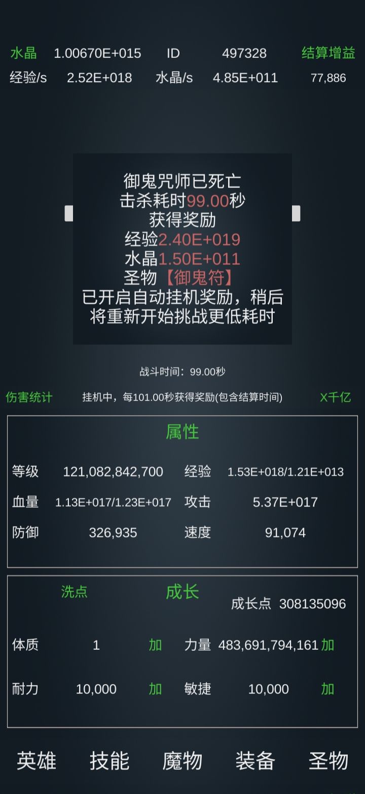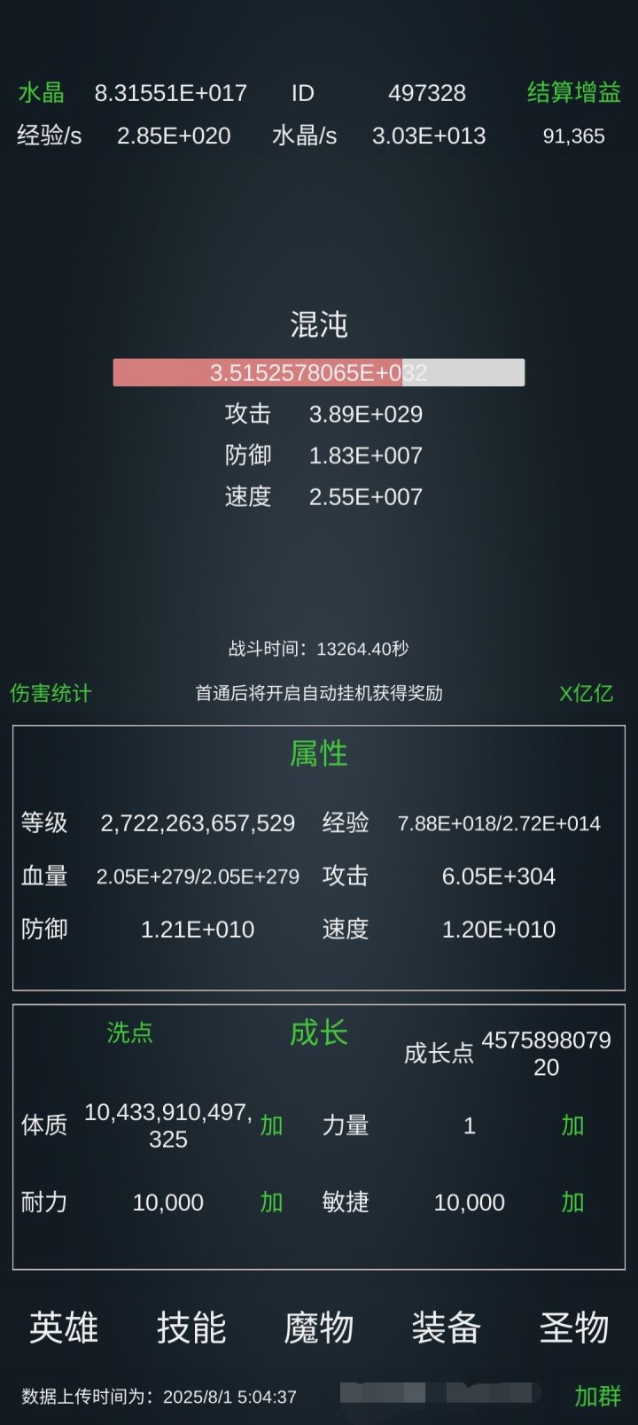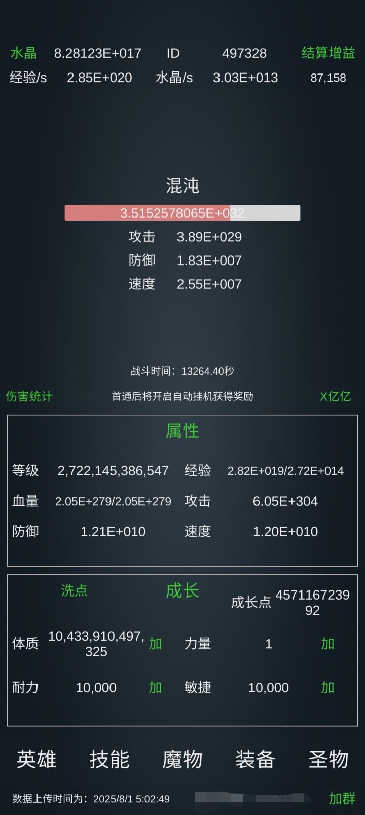 混沌装备:开局5545,当进入稳定阶段后改为2050。衣服可以不洗只是为了少点判定快一点点,但靴子一定要早点洗,因为攻击力成长到6.05E+304会卡死的。圣物:(圣物没说就是不高,没标注等级就是满级) 低级:凝液、幽灵之链、金币、17万马蹄铁、短笛、灵露、拳套; 高级:玄武甲、贤者之石、魔瞳、指环、毒淬灵液、深渊至宝、饮血、凤凰蛋; 超级:医者圣心、徽章、真经、霸者之道、18万小刀、怨
