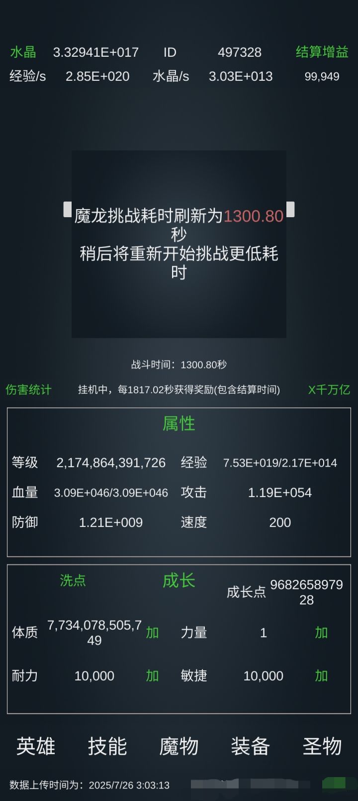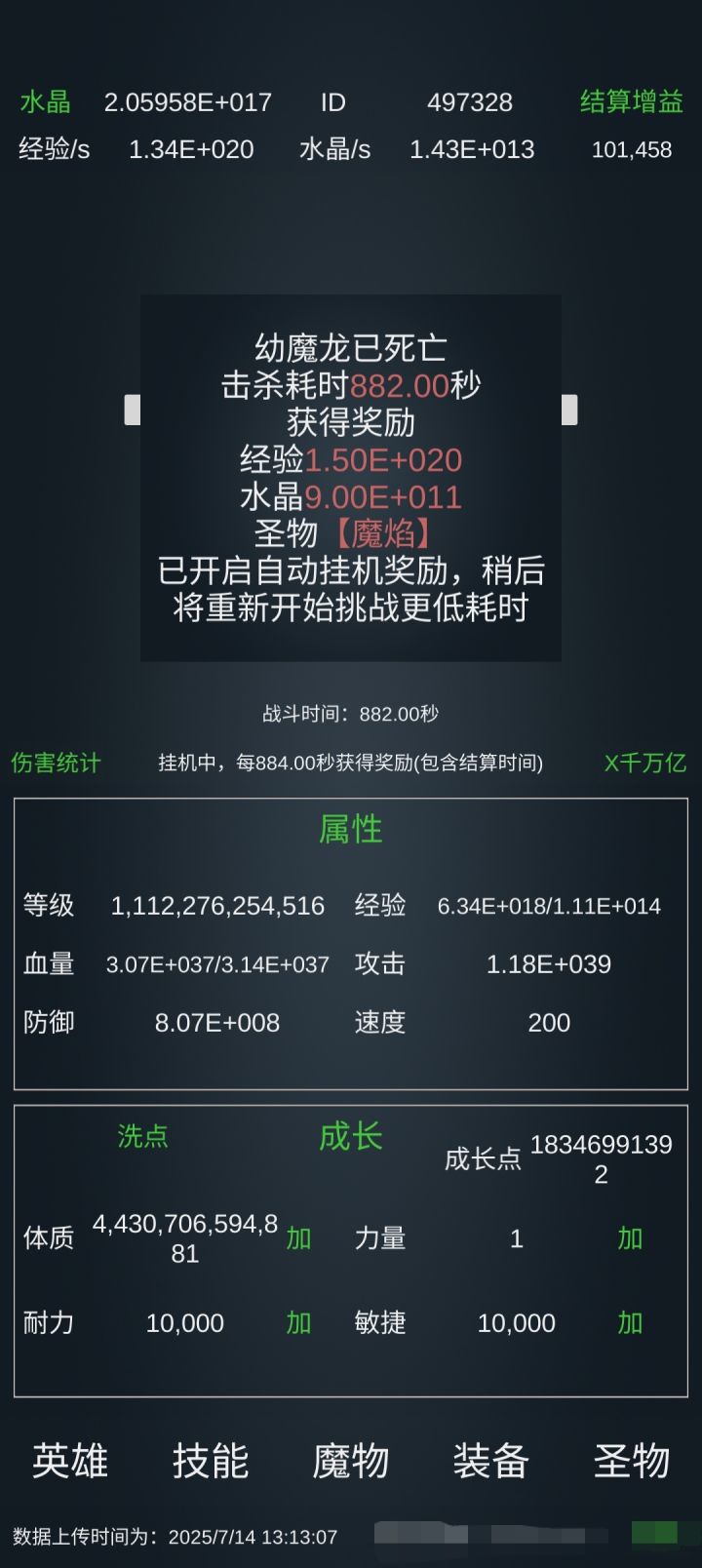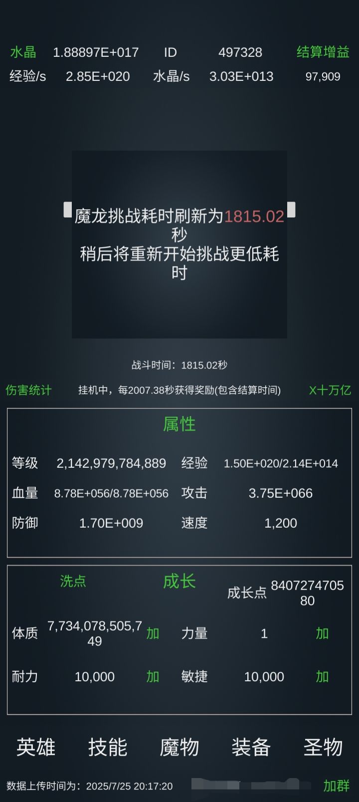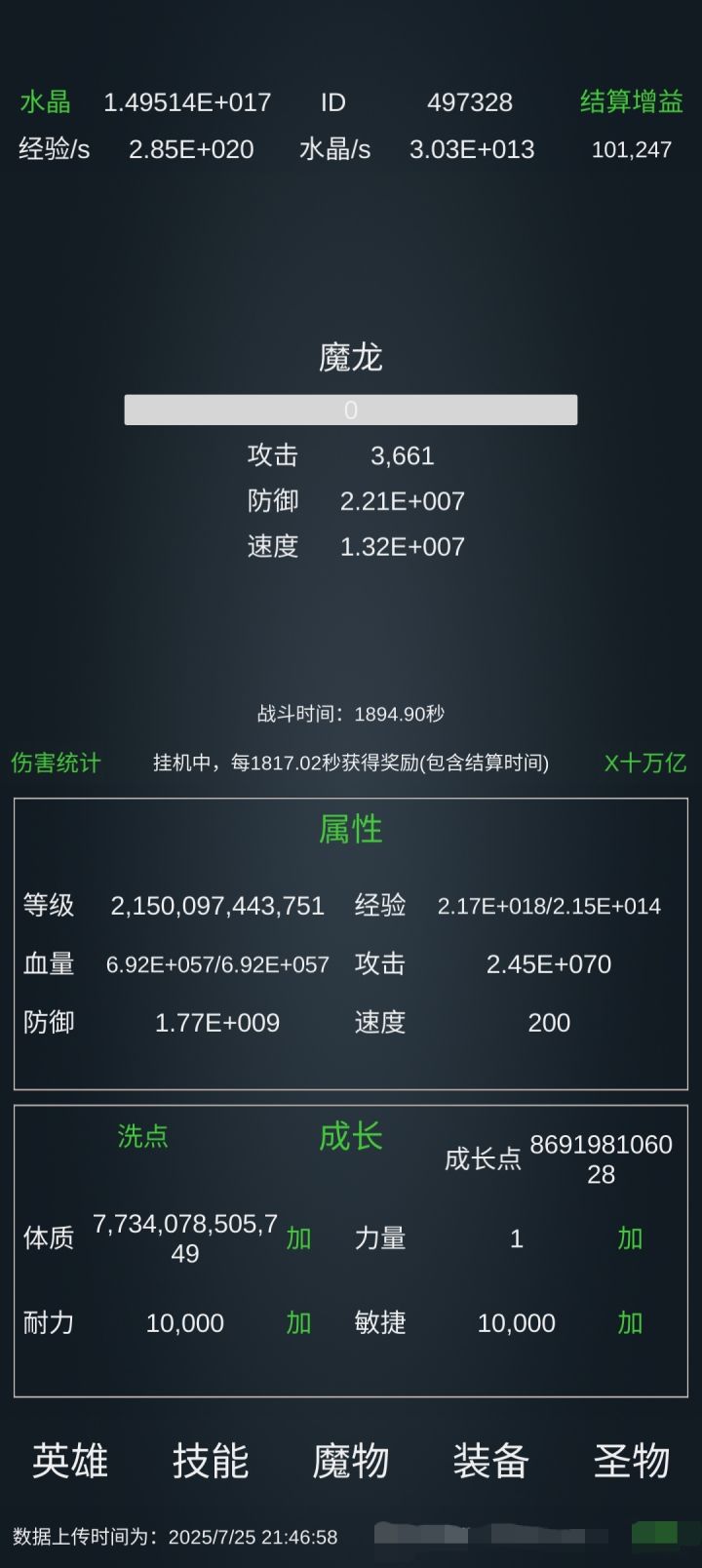 魔龙技能: 基础:1千万亿级力训,百万级耐训。霸者:霸体百万亿、霸盾10万亿、招架百万亿。暗影:观察百万亿、迷踪十万亿。元素:无。圣者:圣罚千万亿,圣光千万亿,圣躯2.1亿亿,圣锁千万亿,治疗10万亿,碎甲10万亿,神力10万亿。装备:开局1545附灵,当防御涨到5、6千万以上后,就可以开满附灵了,这个操作基本能在2千秒内通关。圣物:(圣物没说就是不高,没标注等级就是满级) 低