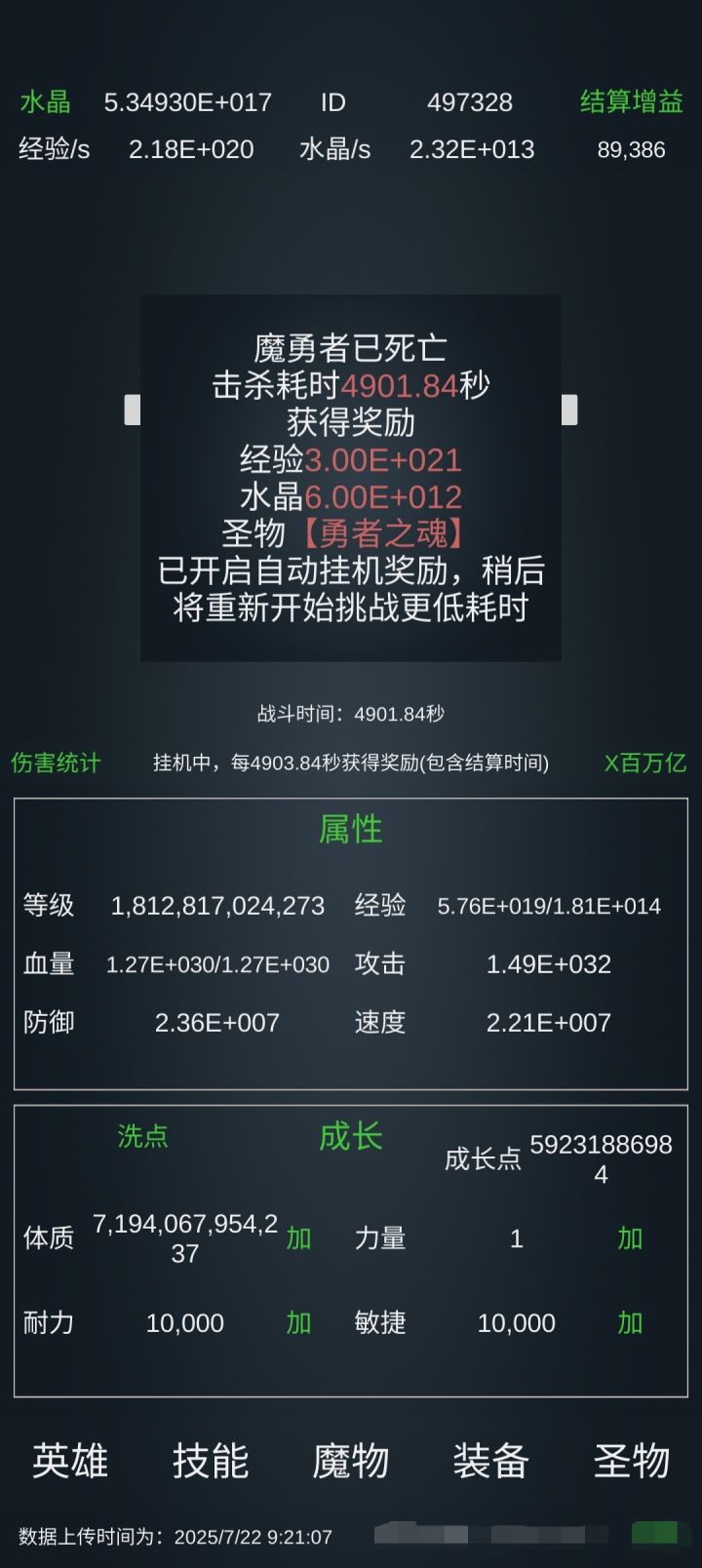 魔勇者技能: 基础:10亿亿级力训,百万级耐训、百万级敏训。霸者:霸者重锤10万亿(可不点)。暗影:暴露、随行点亮,迷踪百万亿。元素:无。圣者:圣罚千万亿,圣躯9000万亿,圣锁千万亿,治疗10万亿,碎甲10万亿,神力10万亿。装备:开局满附灵。 在攻击力比生命值大E+3的时候重置靴子,别贪。圣物:(圣物没说就是不高,没标注等级就是满级) 低级:凝液、幽灵之链、金币、17万马蹄