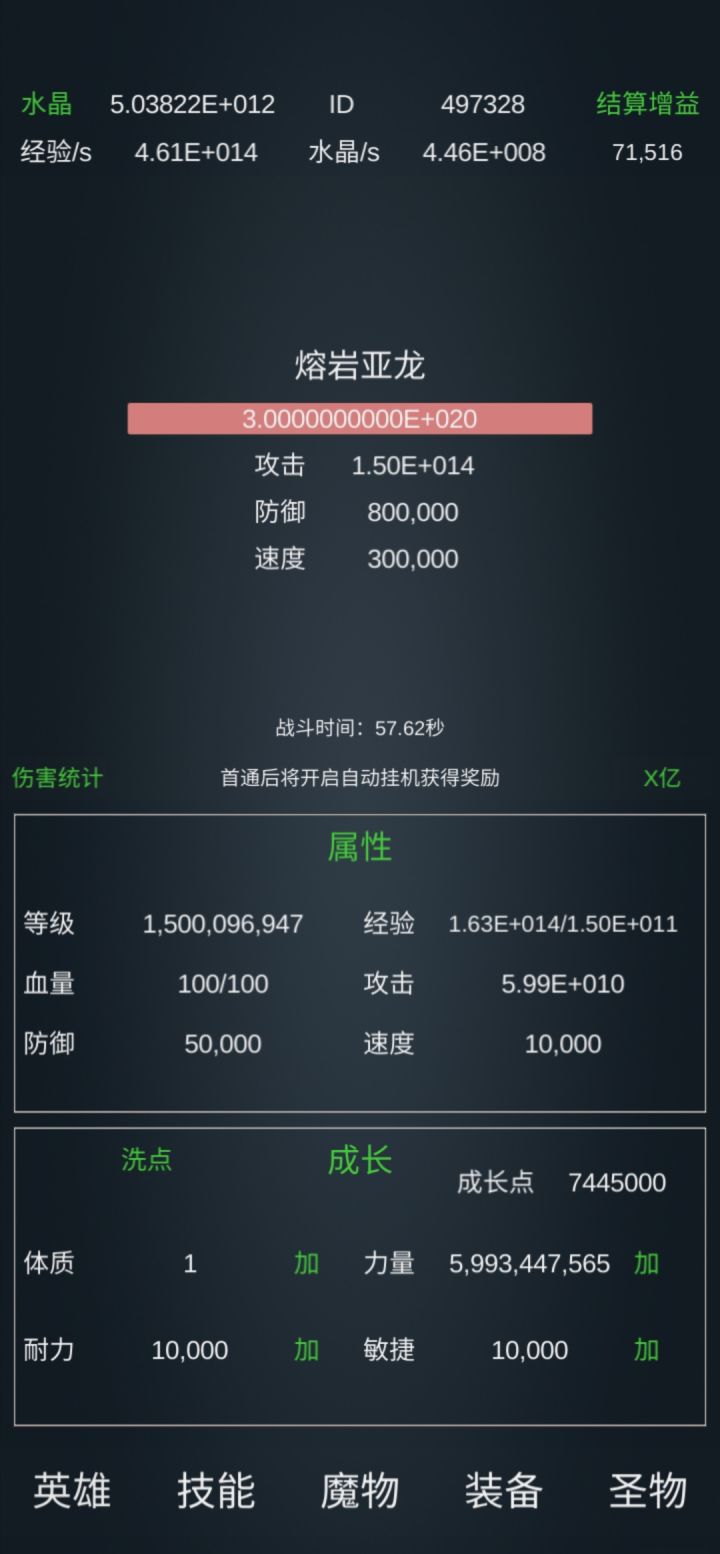 13亿级左右。圣物:满力量拳套、90%精灵短笛、90%凤凰蛋、满玄武甲、满火炬、满器灵、满鸽子、满金币、满深渊至宝,其他的都不高装备:2 2 2 3,建议改成 3 2 2 2,更稳妥一点。技能:基础:1万亿级力量强化(吸血之刃越高,可以点的越少,我只有1万级),千亿级耐力,百亿级敏捷霸者:斩击、嗜血一击各百亿,破碎一击千万,重锤亿级(没啥用)。暗影:疾速10亿级,弱点暴露3百亿级,手里