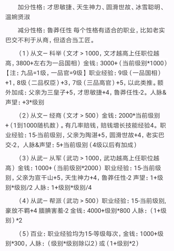 刷子女性格:在孩子两岁冬天时,临睡前存档,三岁春天性格定型,去看孩子性格,不满意就退回读档重来。男孩职业有加成的性格:才思敏捷(科举),天生神力(从军),圆滑世故(经商)女孩较好性格(无职业无加成):冰雪聪明,温婉贤淑才艺加成:每年夏天晚上(天黑),去天灵子买符,男孩➕文才/武功,女孩➕德才男孩不必文武双全,选职业只看一个属性的高低,职业好赚钱多,想要高职需要多刷文才/武功,比如一品