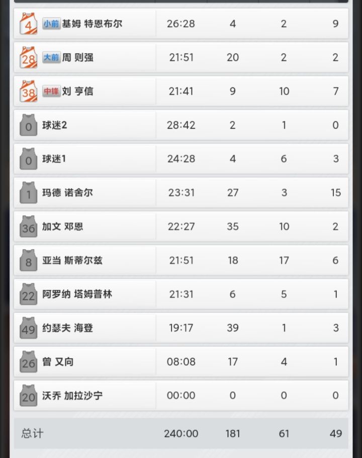 1,自从常规时间最后一分钟下场后,我的大哥7号英格勒姆没有受伤,却再也没有上过场,其他的轮换都是正常的,导致我候补球员杭斯沃尔纳上场时间比大哥都长;2,加时赛中,当节加时比分始终显示0比0(后三个截图)。