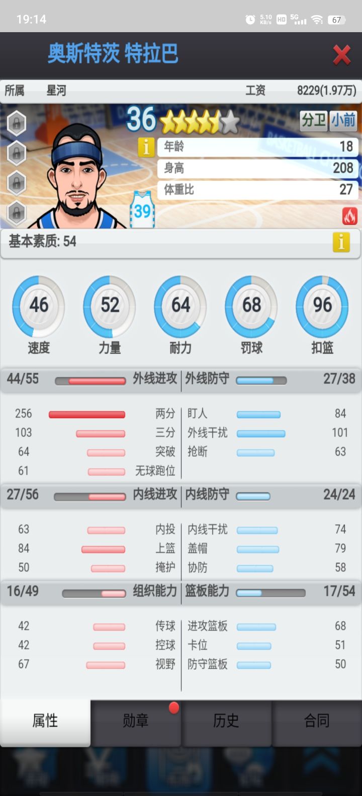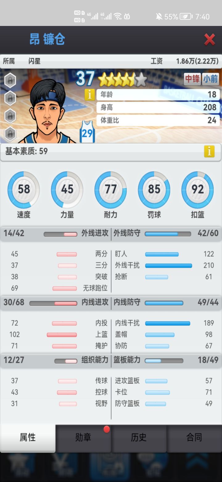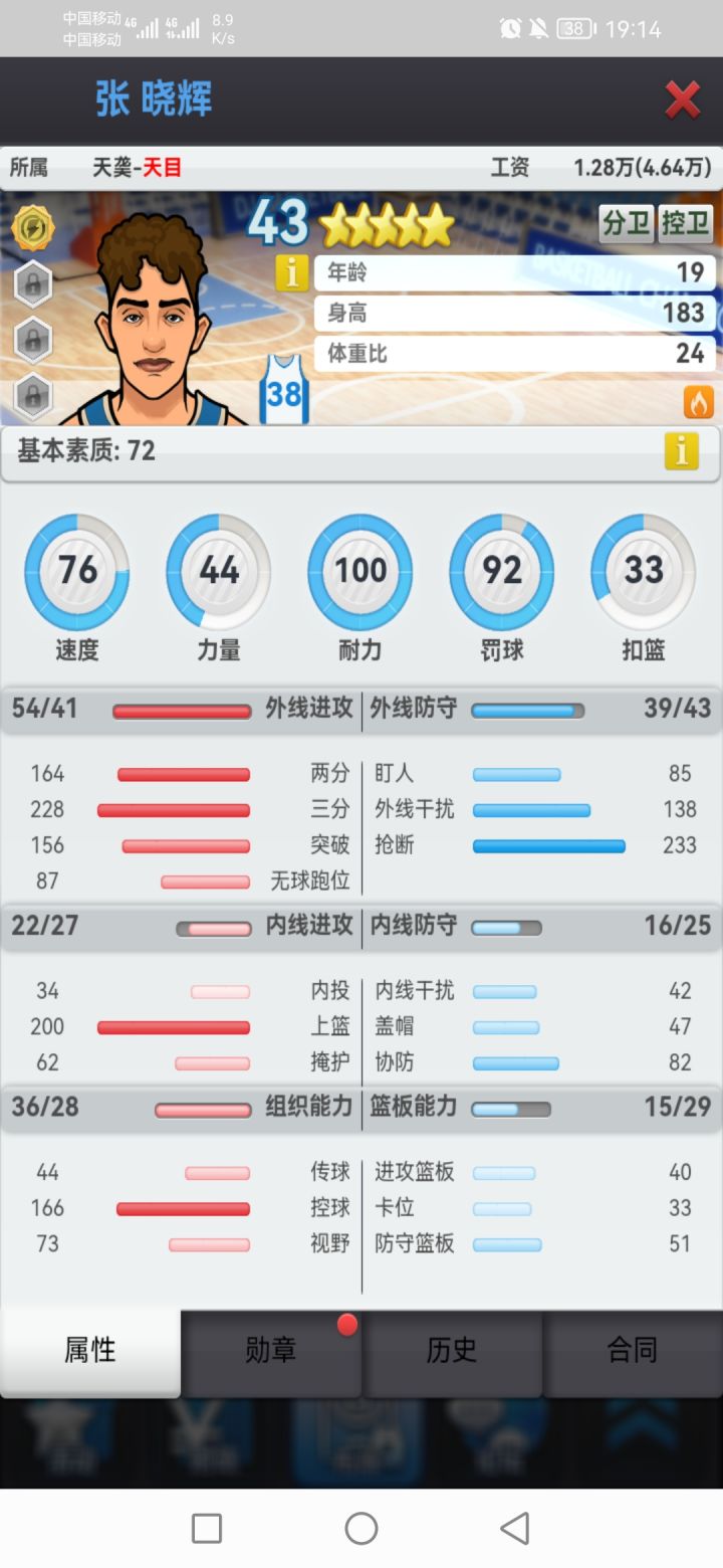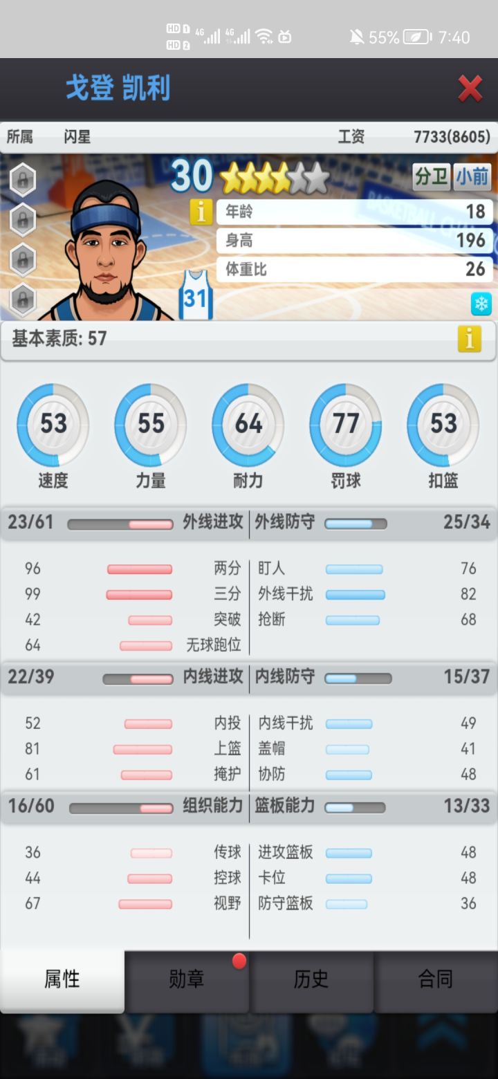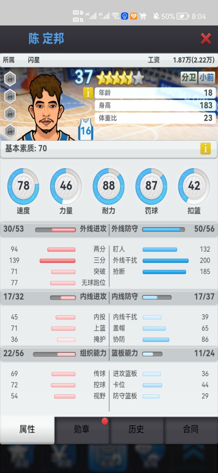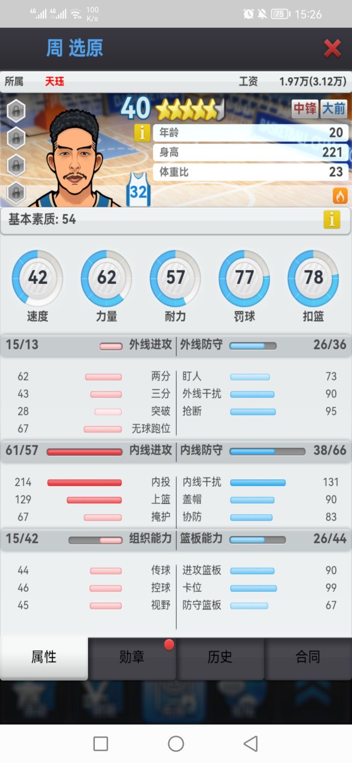 图二是基本素质,速度/力量/耐力是主属性对星级评分和薪资影响极大(都可以通过打章增加,最高23点,上限100,速度/力量勋章代价极大)。