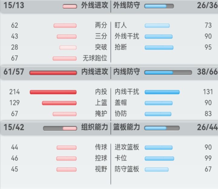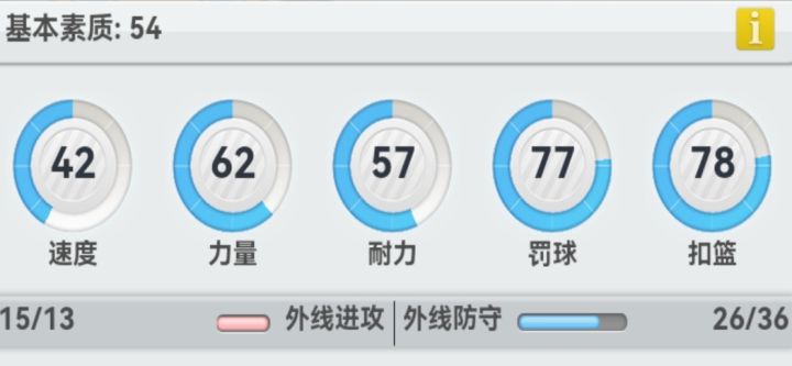 扣篮和上篮命中、抢断盖帽判断正相关,可以通过勋章增加,上限90。