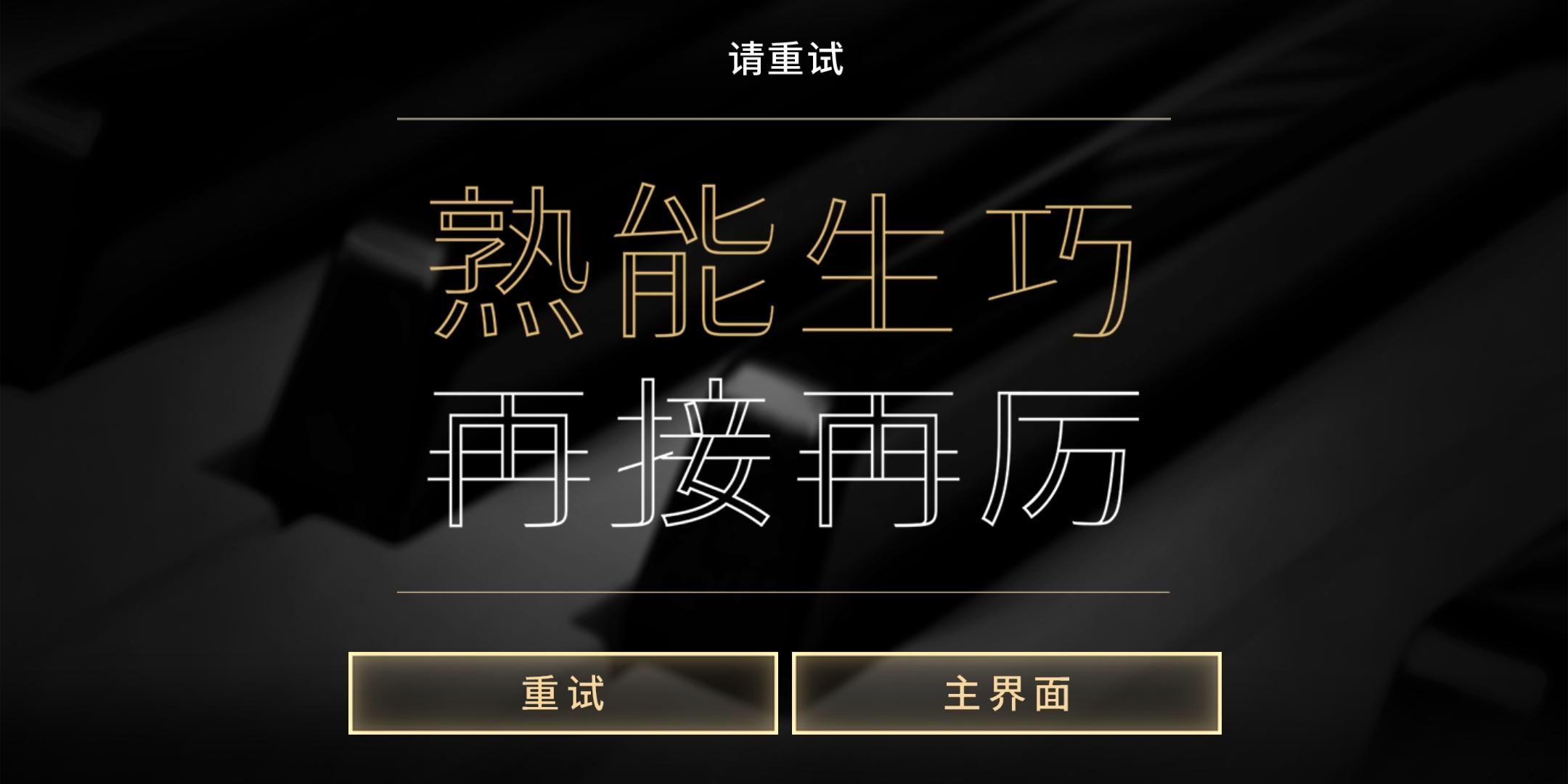 提个建议,在演奏失败后,瞬间弹出的那个界面,能不能改成在两三秒后弹出,好多次都是误触到了自己不要的那个选项就很烦òᆺó像我最近一直在练山魔王的宫殿,点到主菜单又要点进去麻烦死了