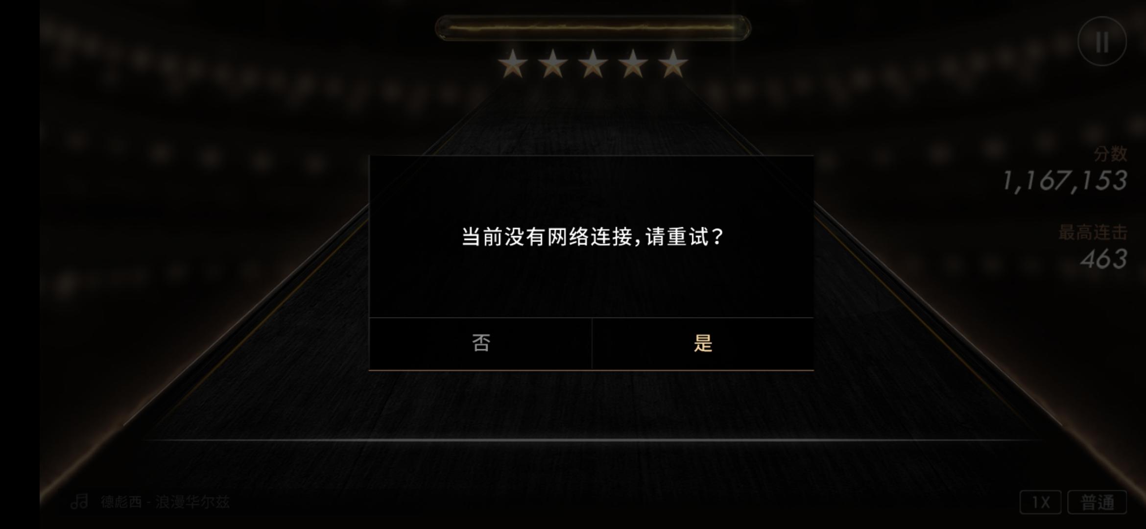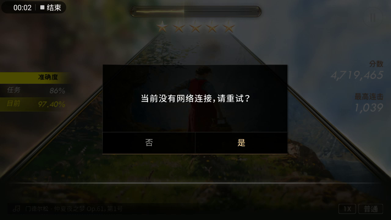 玩的是演奏,第三关最后结算的时候显示无法连接网络,但其他联网的软件都可以用,试了好几次都是这样,还重新弹了几首曲子,还是一样的状况,但是似乎是只跳过结算,最后看结果是更新的,但老是卡在那个页面,不给通过。