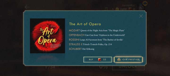 说下建议和问题作为一个古典音乐题材的游戏,希望能在游戏内可以听到已经买了的曲子的完整版而不是只能听片段。还有就是,这游戏国服已经很久没有更新了,是放弃了吗?为什么这么敷衍,对比了一下国际服的曲目,国服比国际服少了很多首,甚至同一张专辑我在国服买到的比国际服还少一首?有些界面也改了反而失去了韵味,明明照搬国际服不就好了?连加载页面都少了很多国服对比国际服真的阉割了不少东西