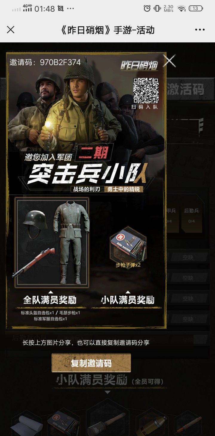 昨日硝烟-新兵招募帝国-南澜 向您发出邀请。 游戏下载:https://www.taptap.cn/app/286785/topic 服务器:昨日硝烟-S101服 邀请码:b3ToXkTBDu有效期至:2024/07/27欢迎加入赤熊一团三营帝国第一陆战师连队