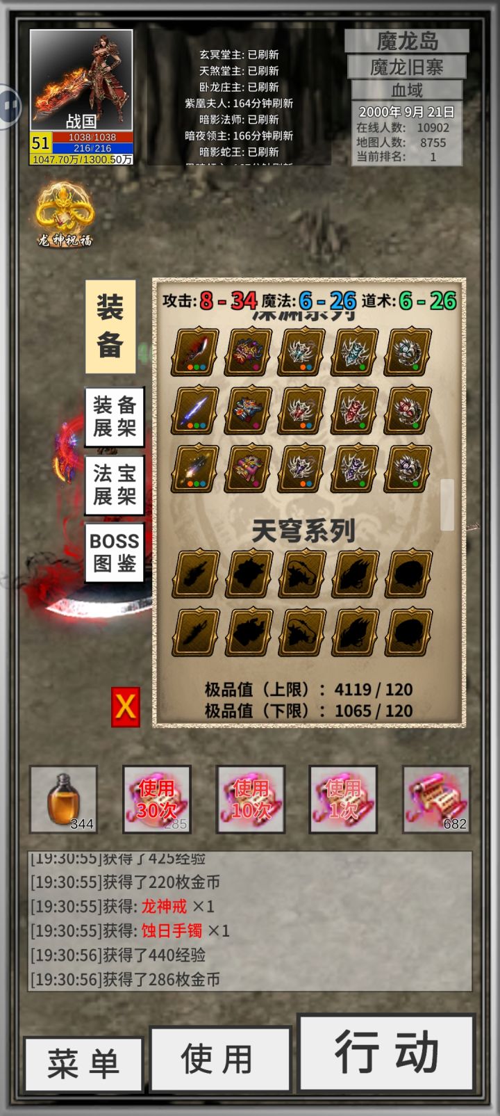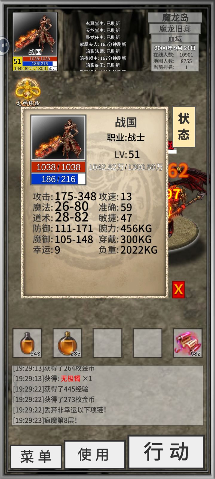 基础篇:1、开局刷九鼎戒指,骷髅大领主掉落,别问为什么刷九鼎,没九鼎玩这游戏就是坐牢,药水带不了几个负重就没了,打怪刚打两分钟背包又没负重了,最关键的是没药水离线时间太短,这游戏红蓝药水就是离线挂机时间战士三四级学了两级基础剑法就能打,看广告,用广告点数直接打骷髅,十次一般都能出个九鼎,倒计时24小时结束前爆率极高,不出就删号重来道士同理,三四级学了精神力和回春术就能打过,不出删号重来法师