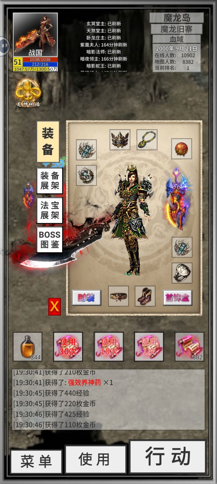 回城和随机只能在快捷栏里使用包里双击没用,重置时间:比如教主刷新时间是120分钟,你等了119分钟,然后点重置时间,BOSS刷新时间就又要等,120分钟了,重置是所有BOSS的时间骷髅大领主:掉落九鼎戒指属性是负重翻倍,也就是神力戒指,BOSS分布:古墓三30分刷新 墨尔本洞穴二40分刷新沃尔玛教主:掉落时空戒指,就是传送戒指,可以快速去一些地图,在使用里操作。分布在沃尔玛三层大厅,一二三层