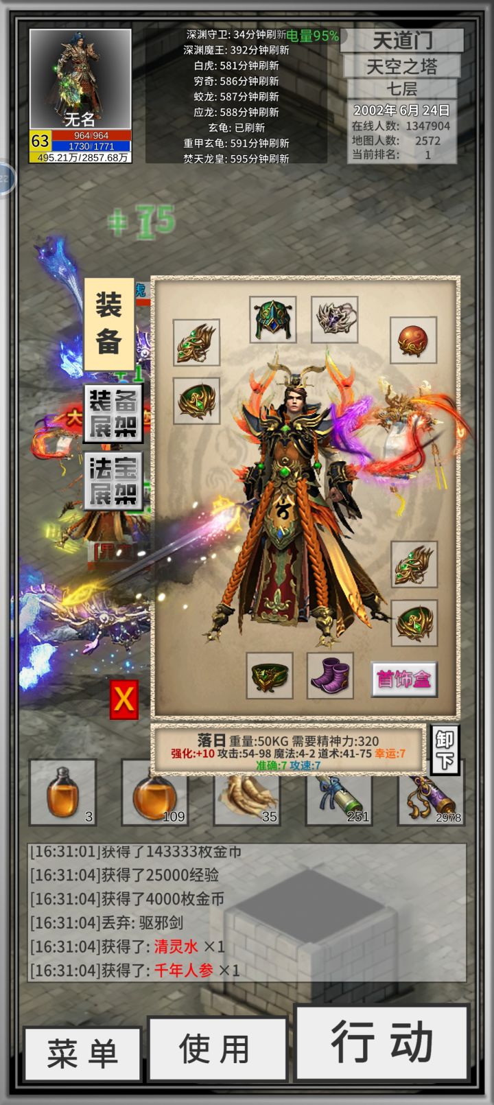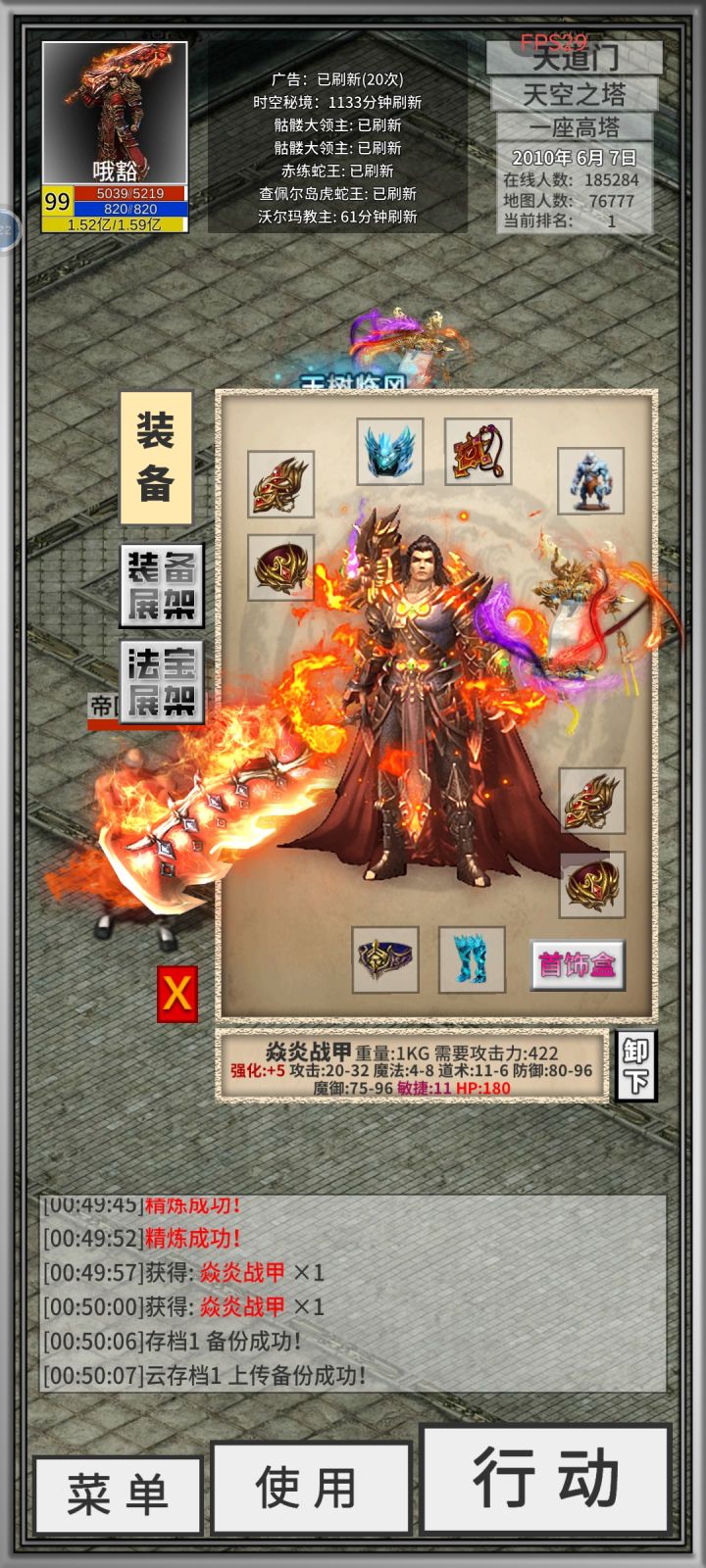 早上爆了一个8速屠龙,接着刷矿刷钱路上爆了3运好开心。花了一上午时间满强化到9,还差一个95纯度矿没刷到,展望最后76攻满速屠龙。