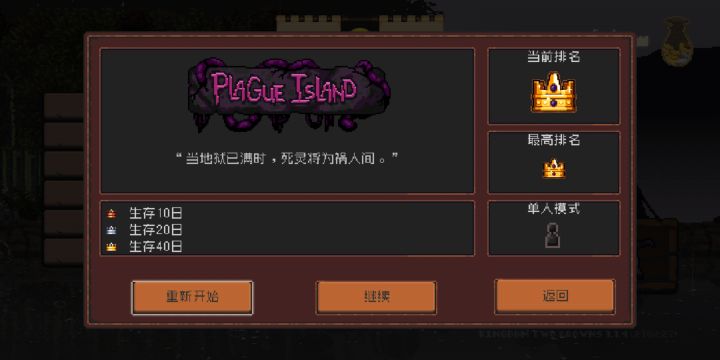 先上图 已经生存四十六天咯瘟疫岛难点主要在于前期防御还没建设好的时候扛不住血月。城墙一旦被攻破这局就直接凉了。后期弓箭手多了,高级墙、投石器有了之后怪基本没有碰到你人民的机会。血月也不用怕,这里后期的血月强度还不如普通关后期的。所以只要抗住第六天和第十六天(大概)的血月就好。第一波血月:这一波血月来的很早,只有面具小怪数量较多,只靠初期的城墙和几个子弓手基本不可能守住。建议开局只招三四个