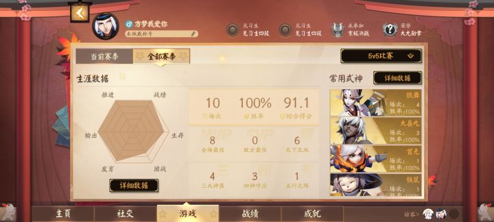 这赛季主要打的是上单妖刀,打野纯坐牢。阴阳术换成了星,自我感觉比豹袭容错高一点。打脆一点的上单像般若还是豹袭好。(为什么我玩肉赢不了)