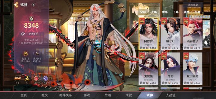 这个赛季阿修罗刚好200把从0肝上省一,想再肝到国服的,结果资质已经不加分了,京极再肝已经来不及了,只能下赛季再肝了本人也不是特别会玩没想到阿修罗的国服分这么高,将近要9400左右欢迎大家加我一起玩呀个人id1008300613