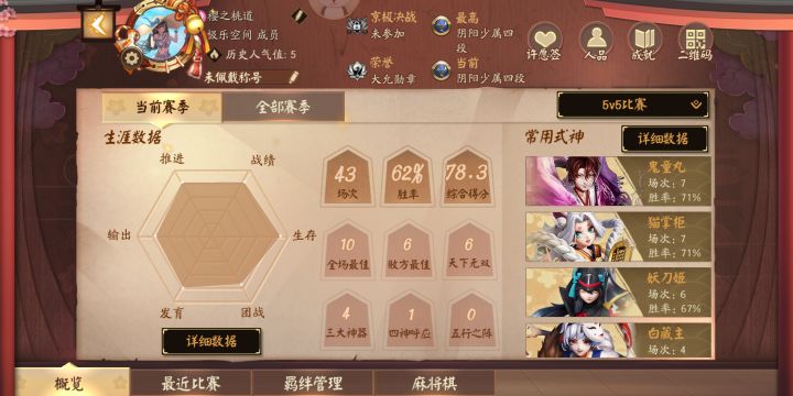 蹲个佛系的小伙伴有时间一块玩儿 本人大三考研党,平时的话中午晚上偶尔在,目前是少属五段,玩的比较佛系,拿资质当匹配的那种(不过都有在好好玩,也不算太坑)平时辅助玩的好一点,其他的位置也都可,希望蹲个佛系的大大一起玩~随缘加好友