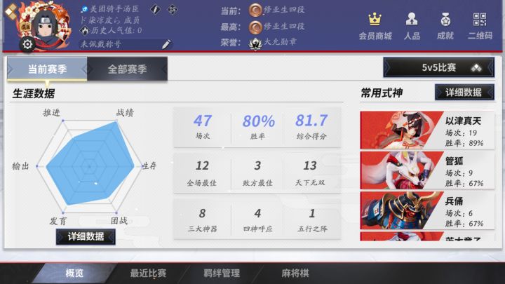 被人擅长御馔津、妖刀、鬼使黑、青坊主。常走上路和打野。嗯,今天被队友坑的心态爆炸。所以招募可靠的队友。寻找擅长祝、巫、守以及侍类的队友。我段位很低,寻找段位和我相差不大且同属夜猫子的朋友。因为刚从王者转过来,有些手生。同样不想再被猪队友坑的朋友可以加我。微信:f17364901174