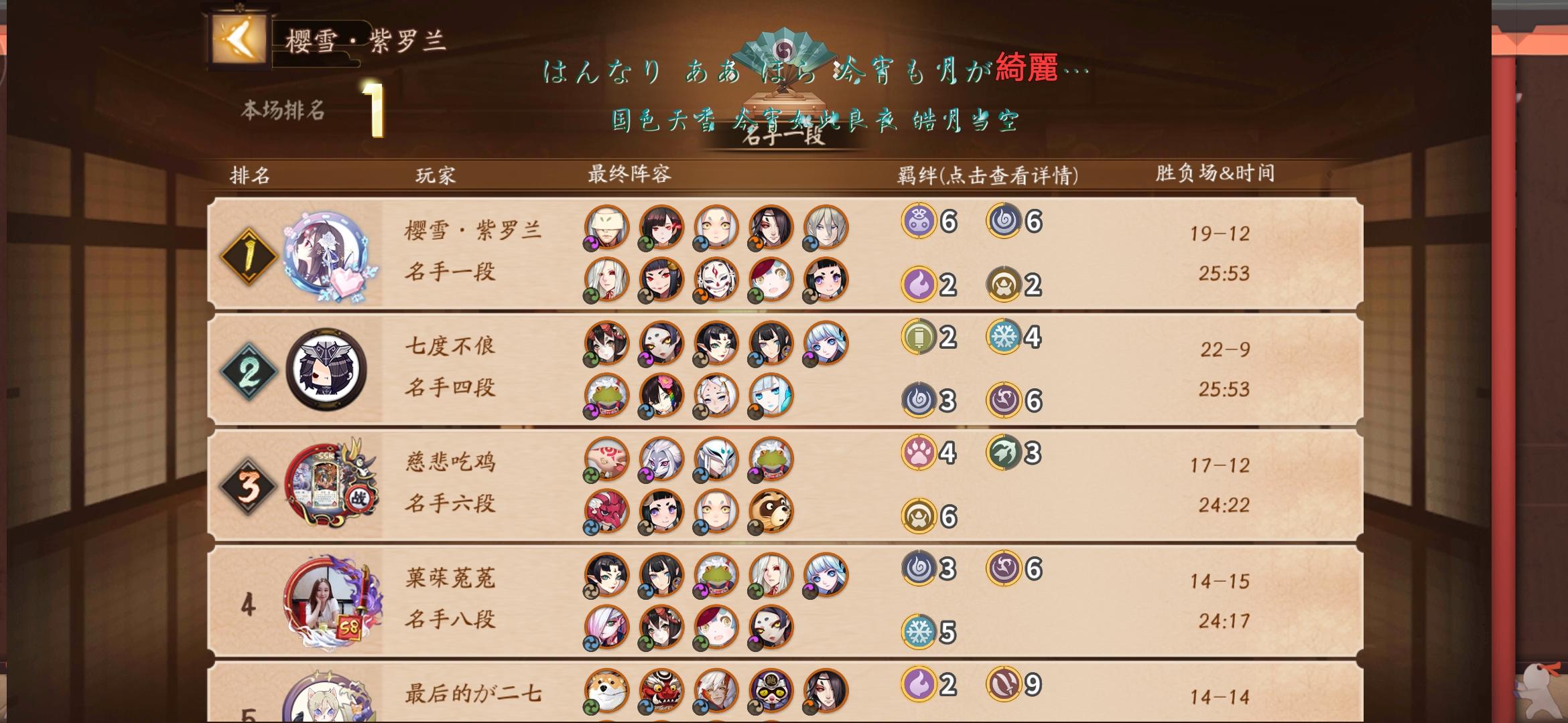 TOP1 玉藻前·妖相·曜之狐TOP2 玉藻前·妖相·九尾狐TOP3 大天狗·妖相·天狗道TOP4 茨木童子·妖相·罗生鬼TOP5 荒川之主·妖相·惊浪TOP6 酒吞童子·妖相·鬼王