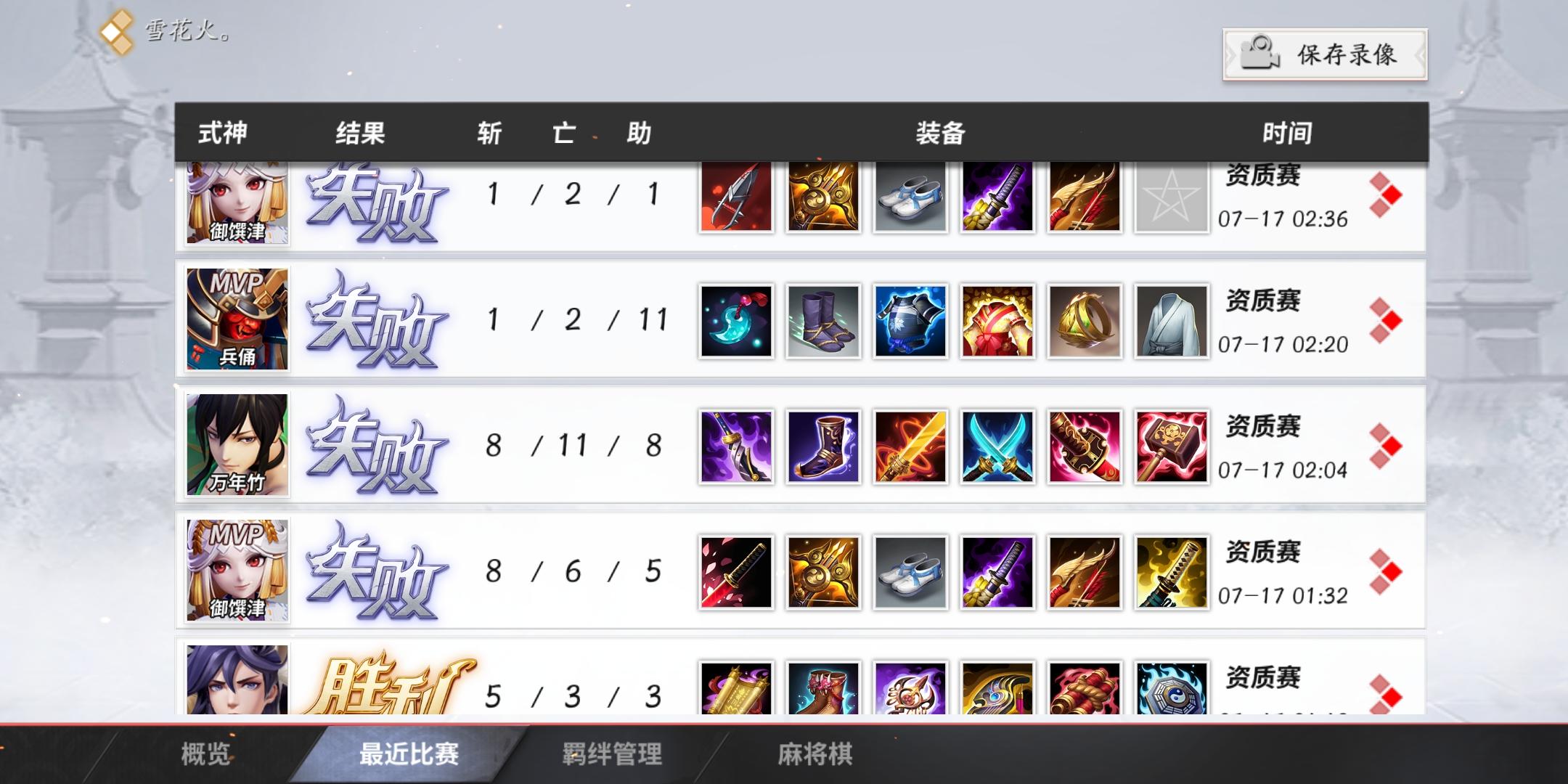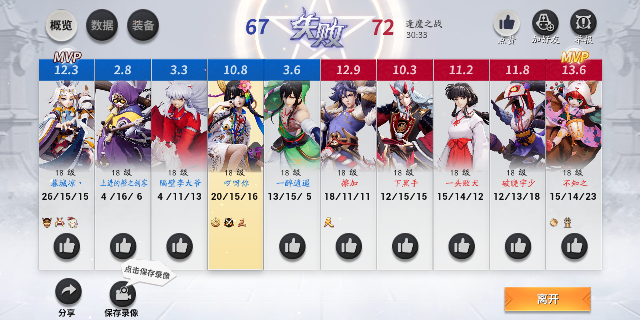 从头送到尾,我让他猥琐他说他清个兵线都能被打死都被打成这样了你还敢出去清兵?镰鼬更厉害,打团不关他的事,爱干嘛干嘛,最后一波团,镰鼬和犬夜叉竟然跑去清兵,结果就剩他俩了,竟然还往对面家跑,